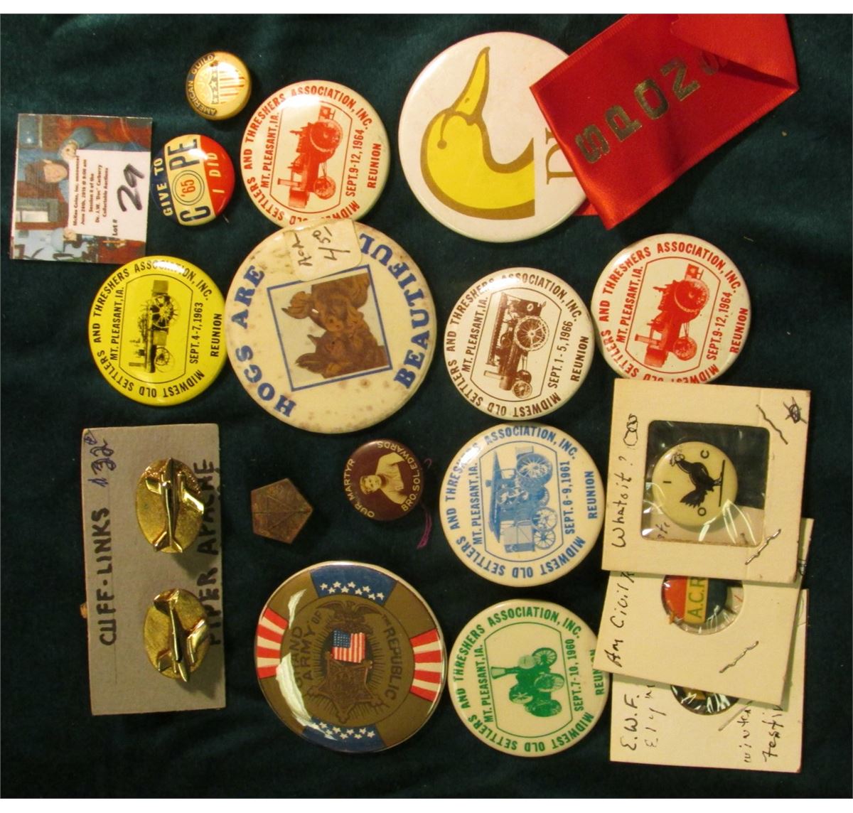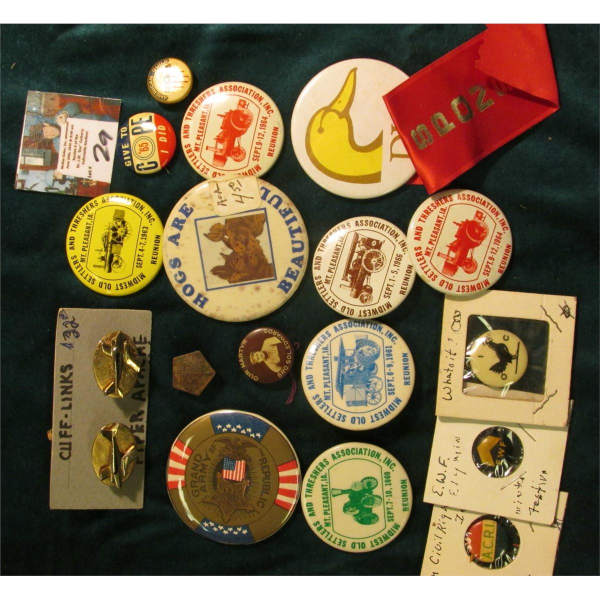 "Grand Army of the Republic" Pin-back; Pair of Piper Apache Cuff-links; American Civil Rights Institution Pin-back; "Our Martyr Bro. Sol. Edwards" Button hole Pin; "OIC" Pin-back with a crowing rooster depicted; "EWF" Pin-back; Unusual Button hole Pin; "American Guild P.J.B."; Ducks Unlimited Sponsor Pin-back with Ribbon; "Hogs Are Beautiful" Pin-back; "Give to/C('65)PE/I DID" Pin-back; 1960, 61, 63, (2) 64, & 66 Pin-backs from "Midwest Old Settlers and Threshers Association, Inc. Reunion Mt. Pleasant, Ia.".