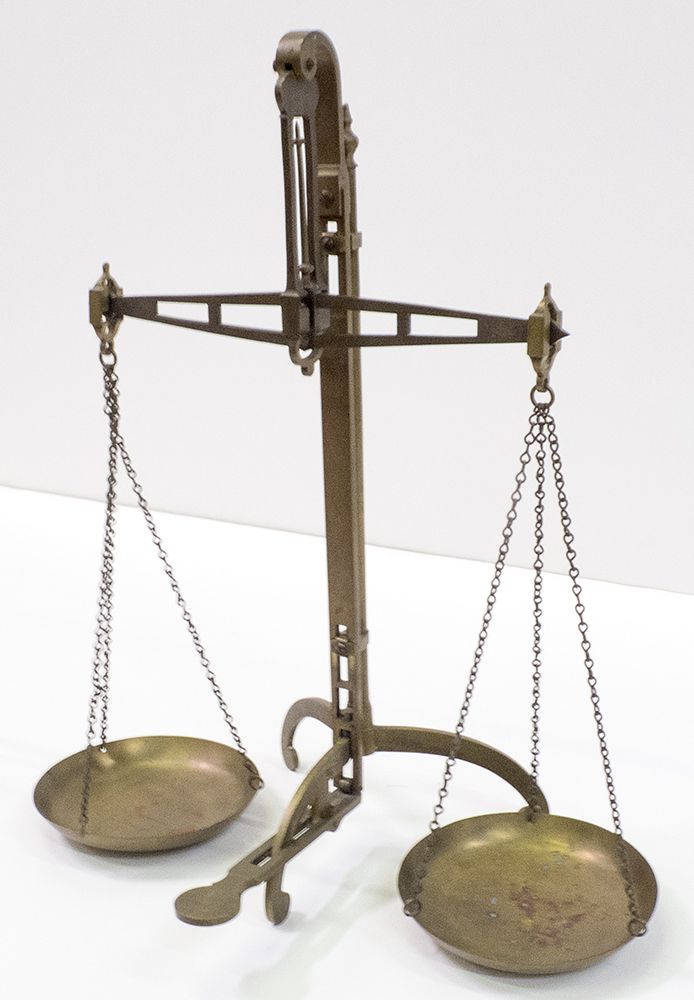 c1900 This is a very large balance scale, all brass construction. It measures 24" high, with 8" dia. trays that are chain suspended. The tripod base has an adjusting lever mechanism. Ornate workmanship, very heavy also. Condition is almost excellent. - HKA#66005