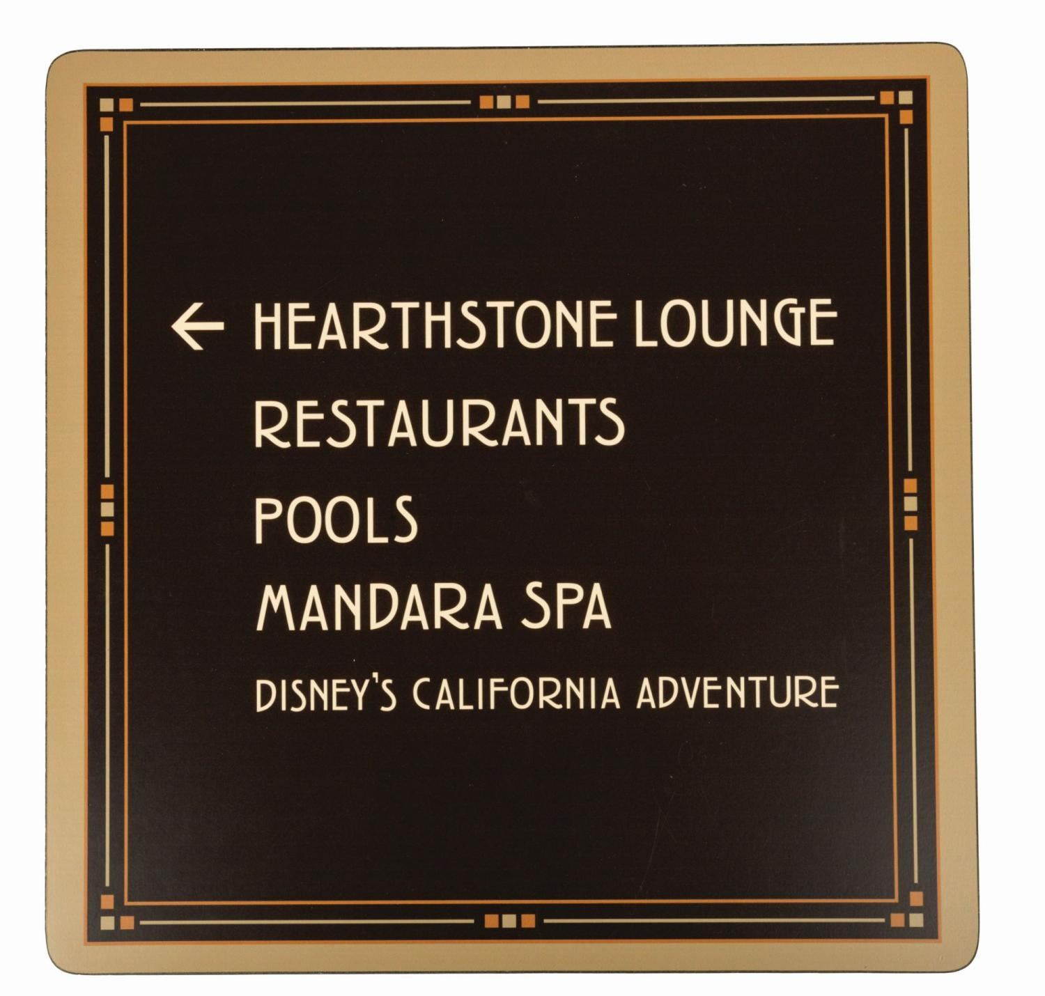 (Grand Californian, c.2010s) A directional wall sign from the Grand Californian Hotel & Spa at the Disneyland Resort. Printed on lightweight pvc board, the sign's border artwork and lettering are patterned after the hotel's celebrated American Craftsman design. Signs like this appear in the lobby and throughout the Resort grounds, directing patrons to the many amenities. Measuring approximately 18"x18", the piece is in very good condition with minor edgewear from resort use.