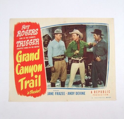 Grand Canyon Trail Roy Rogers Signed Original Lobby Card "Grand Canyon Trail" (1948) is one of the better Roy Roger's Republic Pictures program features. Many remember it as the only Western with a haunted house! This is an original Lobby Card from the movie signed by the King of the Cowboy's himself, Roy Rogers. Lobby Card is 14"x11".