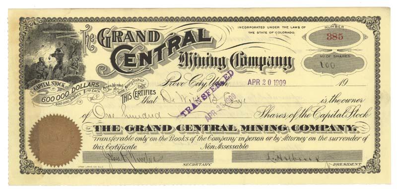 1909, Colorado. Stock certificate for 100 shares. Black on light yellow paper with attached embossed gold company seal. Vignette at top left of miners at work. Stamp cancelled and very fine.
