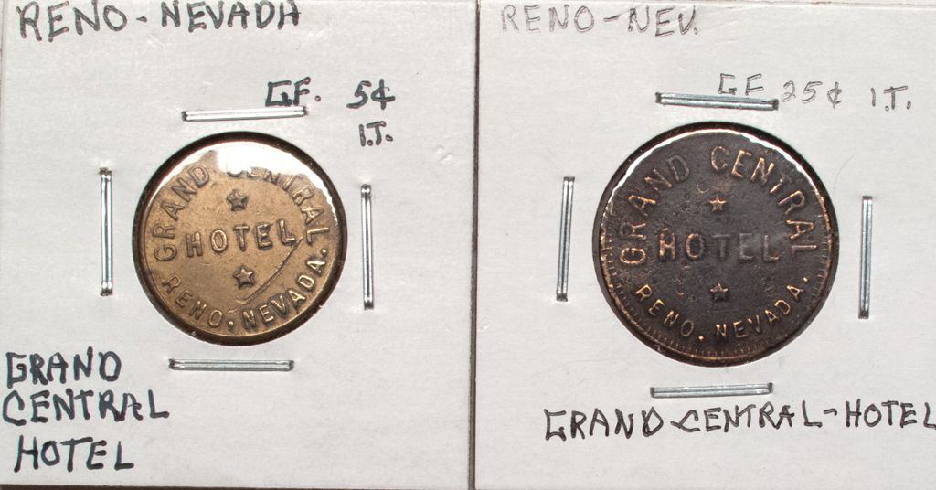 Lot of two. Grand Central Hotel / Reno, Nevada // GF 5c IT. 2) Grand Central Hotel / Reno, Nevada // GF 25c IT. The Grand Central was the site of a shooting that lead to the last lynching in Reno in 1891.City: RenoCounty: WashoeState: NVDate: