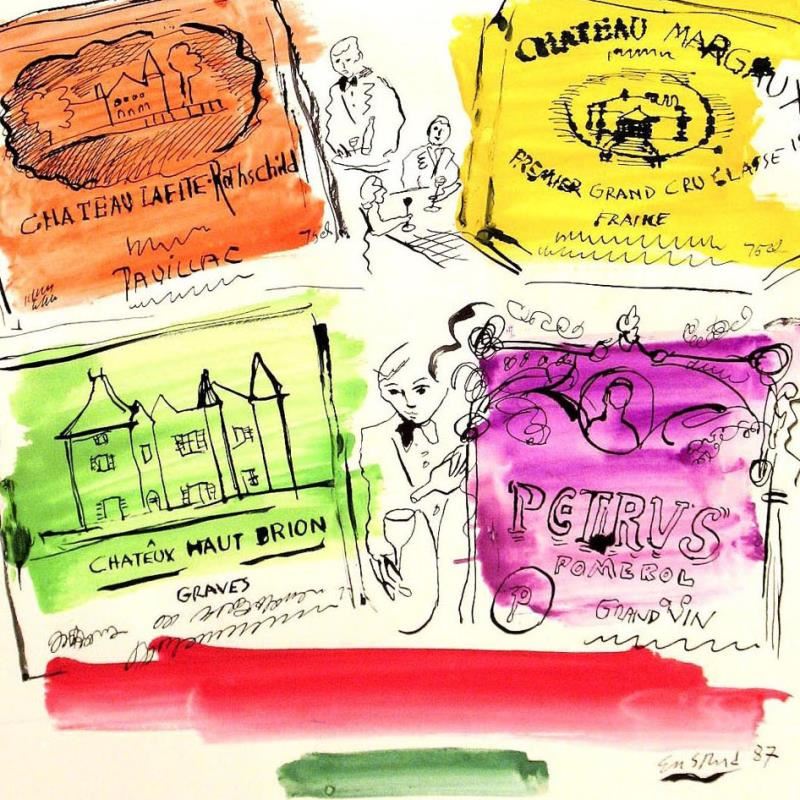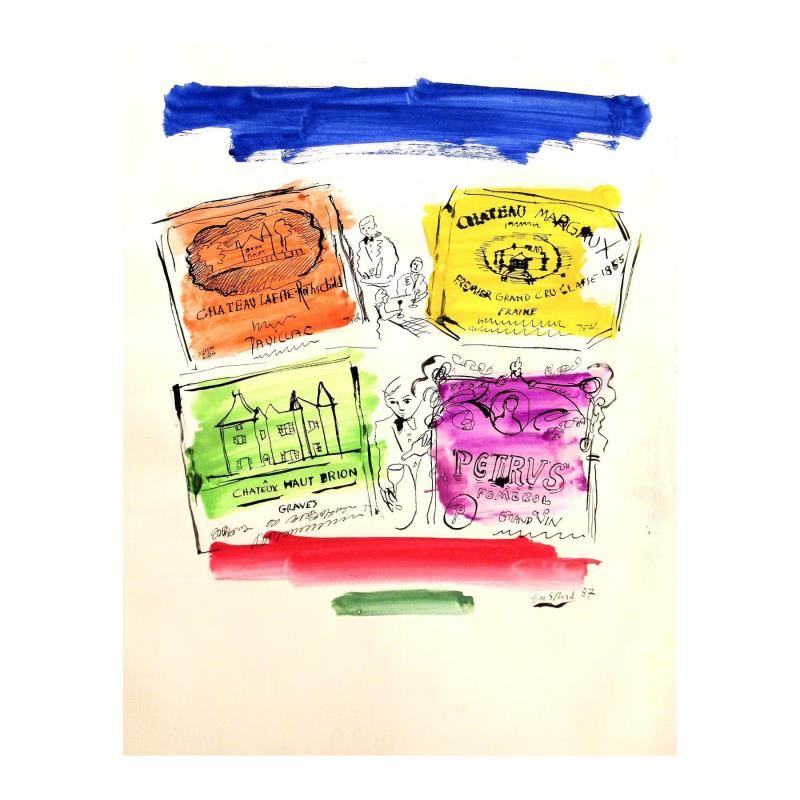 "Grand Cru Wine Labels" is an original Mixed Media on Paper by Wayne Ensrud. The piece is hand signed by the artist and comes with a Certificate of Authenticity. Measures approximately 30" x 22".