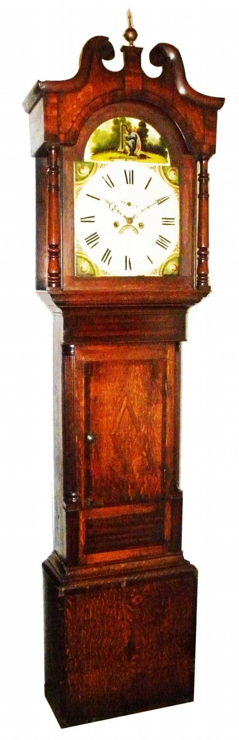 Grand Father Clock. Tiger oak cabinet. Complete with weights, pendulum and key. Very good working condition. 19 1/2 X 92 X 9 1/2 inches.
