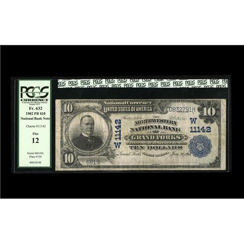 <B>Grand Forks, ND</B></I> - $10 1902 Plain Back Fr. 632 <B>The Northwestern NB </B></I> Ch. #(W)11142<BR>This bank survived for only 11 years, printing Plain Backs only prior to its closure in the Summer of 1929. <B>PCGS Fine 12.</B></I>