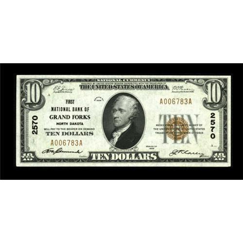 <B>Grand Forks, ND</B></I> - $10 1929 Ty. 1 <B>The First NB</B></I> Ch. # 2570<BR> A wonderful note with plenty of embossing and decent margins. <B>Very Choice Crisp Uncirculated</B></I>.<BR><I>From The Kansas City Collection.</B></I><BR><BR><b>Shipping:</b> Coins & Currency (<a target="_blank" href="http://www.heritageauctions.com/common/shipping.php">view shipping information</a>)