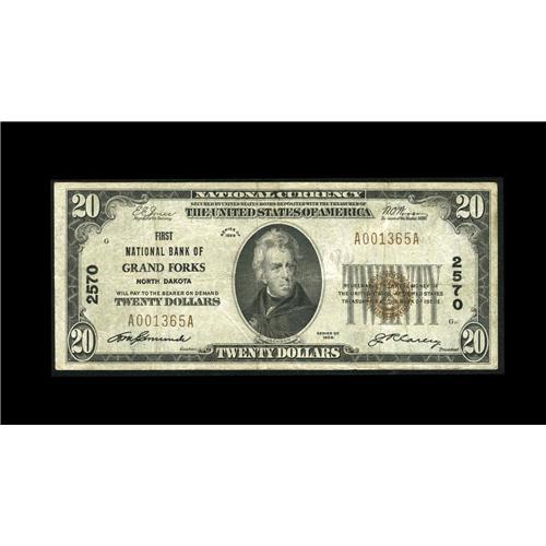<B>Grand Forks, ND</B></I> - $20 1929 Ty. 1 <B>The Citizens NB </B></I> Ch. # 2570<BR>A problem free <B>Fine-Very Fine</B></I> from a community just across the river from Minnesota.