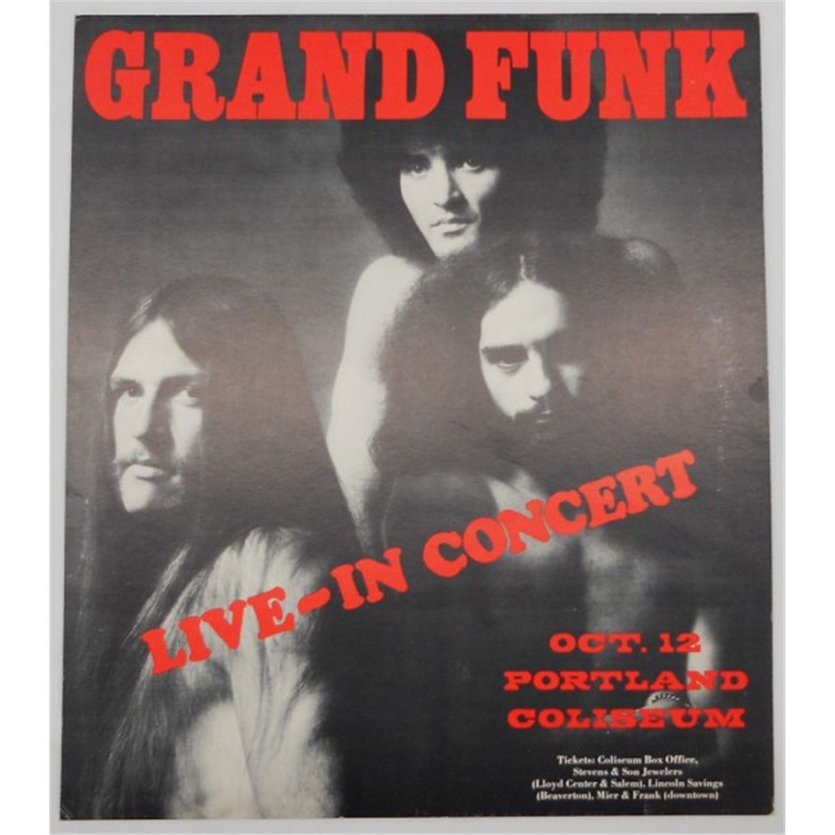 This is an original Grand Funk concert poster for a concert held October 12, 1972 in Portland, Oregon's Memorial Coliseum. Printed on very heavy card stock there are NO tack holes and just a ding or two to the corners and edges, displays well and will be sent flat, as this has never been rolled. Size is 13 5/8" x 15 3/4".