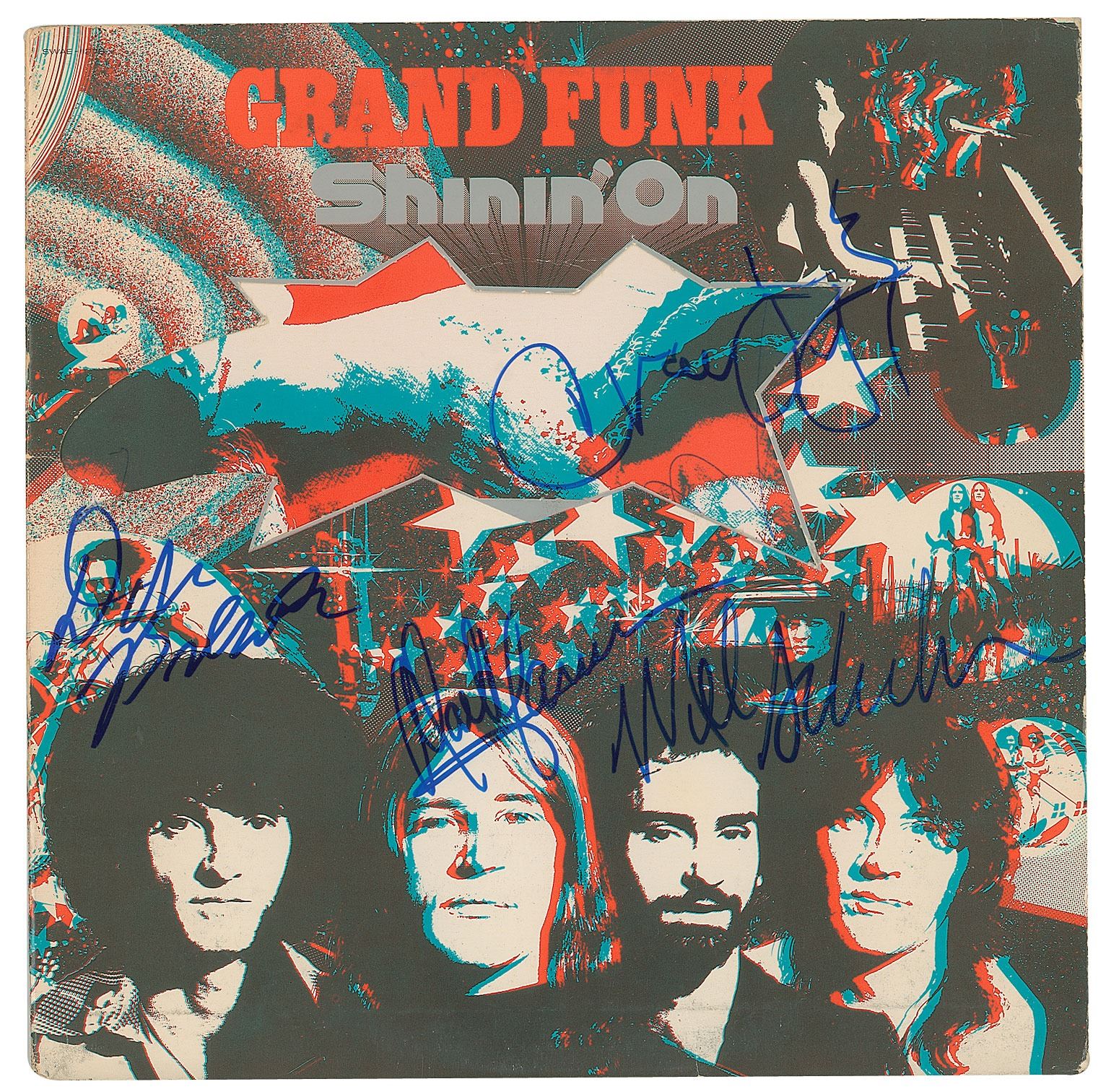 Shinin' On album by Grand Funk Railroad, signed on the front cover in blue felt tip by Mark Farner, Craig Frost, Mel Schacher, and Don Brewer. In fine condition, with some light edge wear. The record is included.