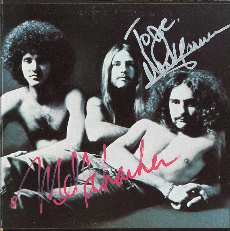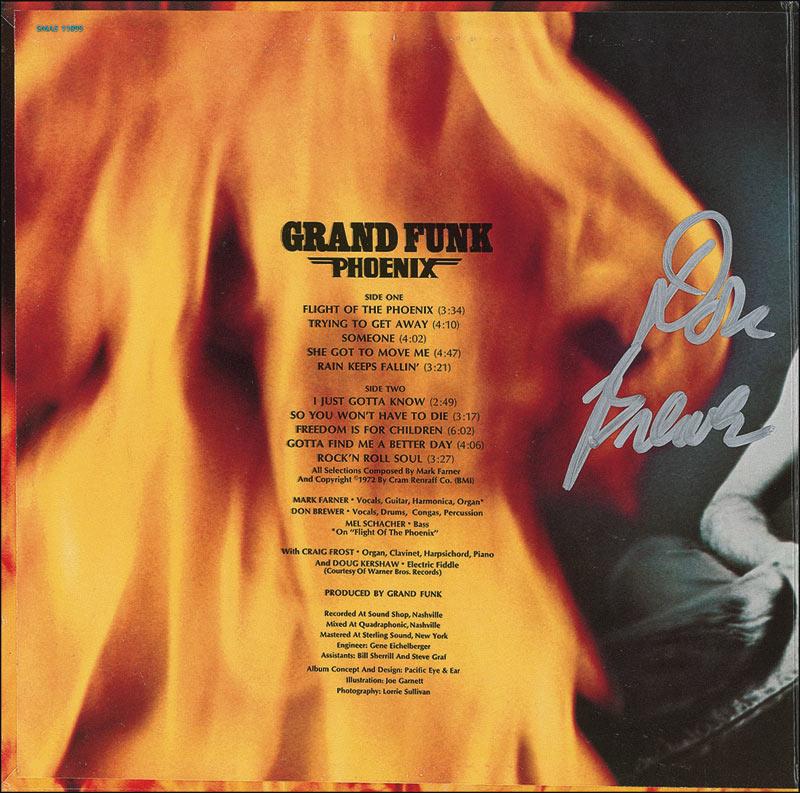 Phoenix album signed on the inside gatefold in red and silver ink by Mark Farner, Don Brewer, and Mel Schacher. In fine condition. The record is included.
