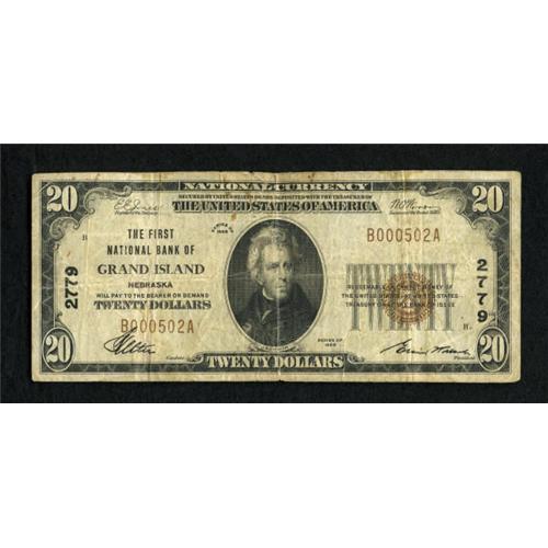 <B>Grand Island, NE</B></I> - $20 1929 Ty. 1 <B>The First NB</B></I> Ch. # 2779<BR> This <B>Fine</B></I> $20 has some paper clip rust and an approximate quarter inch tear at top center.<BR><BR><b>Shipping:</b> Coins & Currency (<a target="_blank" href="http://www.heritageauctions.com/common/shipping.php">view shipping information</a>)