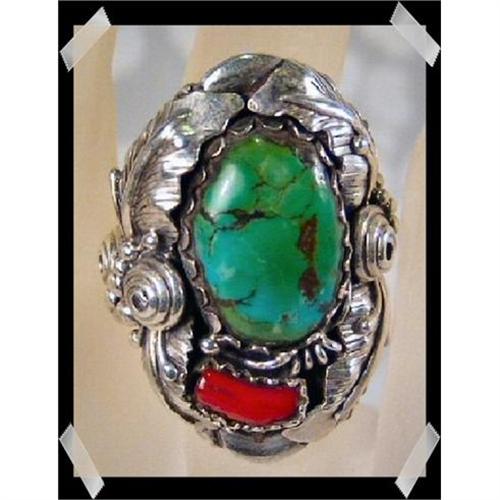 Bold designs set in 925 Sterling Silver definitely not for the faint of heart. Size 9.5 and 24 grams of pure luxury. Coral and Turquoise all framed in Sterling. The ring has a height of 40mm or approximately 1.58 inch. (c-60)
