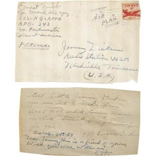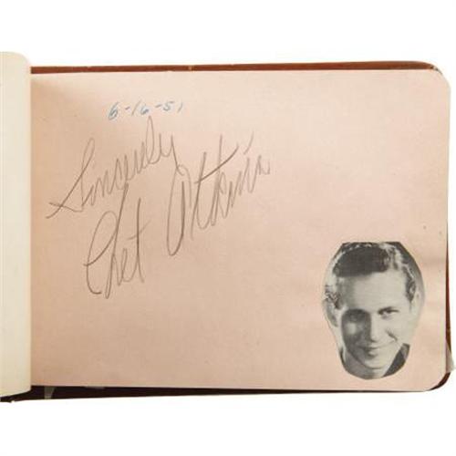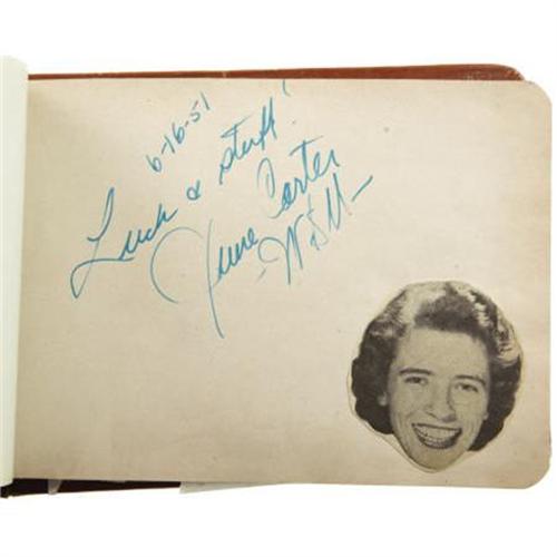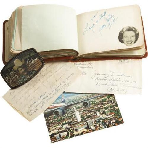 <B>Grand Ole Opry Legends Autograph Archive.</B></I> Included is a leather-bound autograph book containing multiple signatures from the early '50s from Grand Ole Opry legends June Carter (two signatures, both dated 1951), Roy Acuff, Ernest Tubb, Chet Atkins, Minnie Pearl, Hank Snow, Cowboy Copas, Uncle Dave Macon, Carl Smith, and many others. Also included is handwritten, signed correspondence from Ernest Tubb to Little Jimmy Dickens, as well as a commemorative Jimmy Dickens belt buckle. All items were originally owned by Little Jimmy Dickens' personal secretary. In Very Fine condition with age-tanning and minor surface scratches to belt buckle. <I>Accompanied by a COA from PSA/DNA.</B></I><BR><BR><b>Shipping:</b> Miscellaneous Collectibles, Smal (<a target="_blank" href="http://www.heritageauctions.com/common/shipping.php">view shipping information</a>)