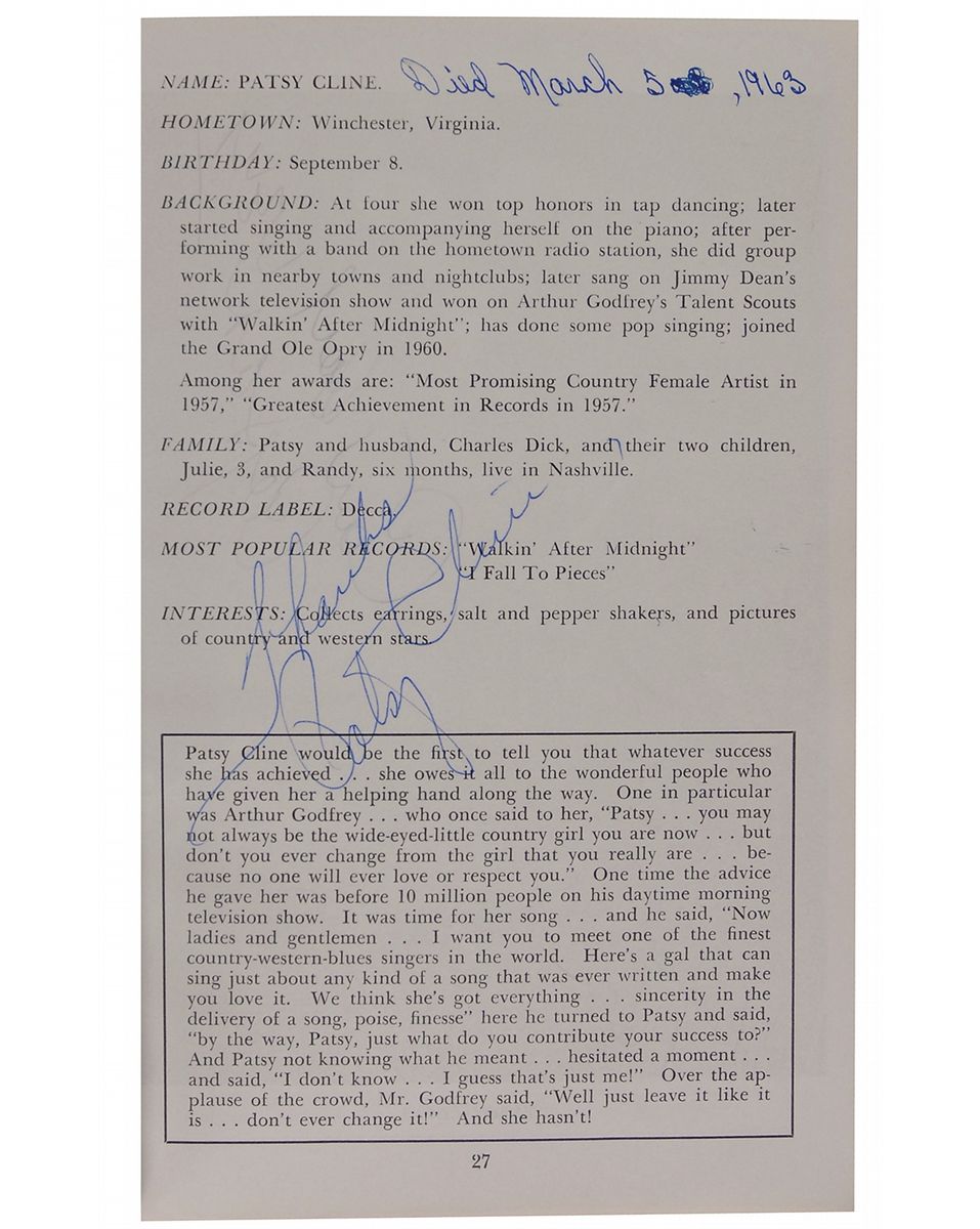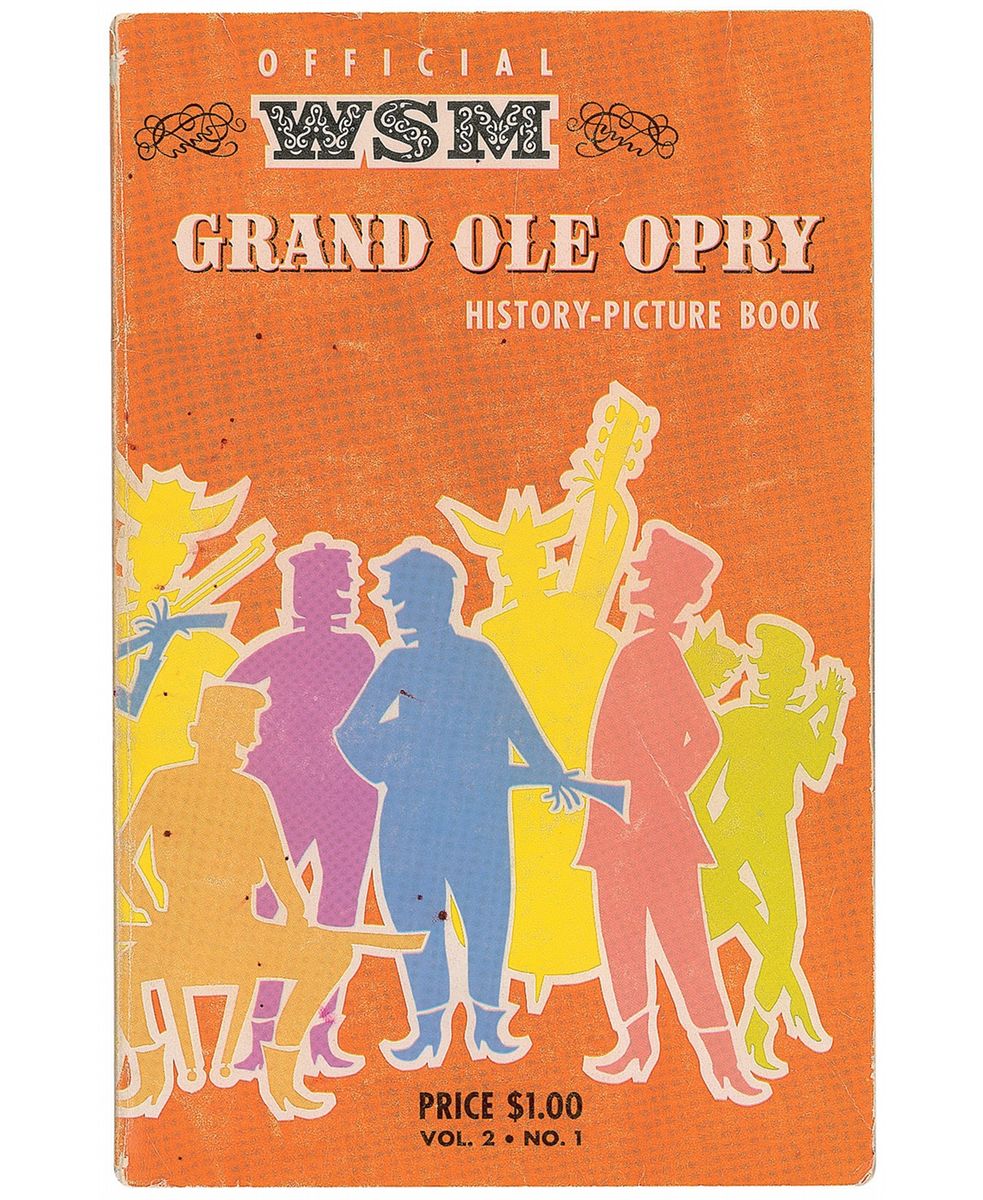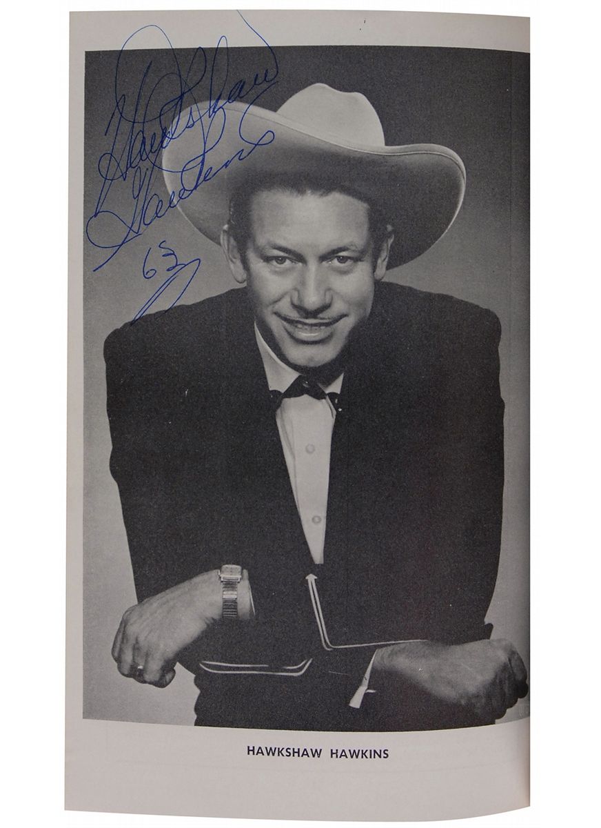 Original official 1961 WSM Grand Ole Opry History-Picture book, Volume 2, No. 1, 5.5 x 8.5, 144 pages. Signed inside on their full page images or bios by 28 performers, including country greats Patsy Cline, Cowboy Copas, and Hawkshaw Hawkins, all three of whom perished in a plane crash on March 5, 1963. Other signers include: Roy Acuff, Margie Bowes, Archie Campbell, Bill Carlisle, Willma Lee, Stoney Cooper, Skeeter Davis (ins), Roy Drusky, Chuck Glaser, Billy Grammar, Stonewall Jackson, Cousin Jody, Bobby Lord, Ira Louvin, George Morgan, Stringbean, Porter Wagoner, the Wilburn Brothers, The Willis Brothers, and Del Wood. The Cline and Copas signatures are back-to-back. In fine condition, with scattered light wear, creasing and rubbing to covers, and a small tear to back cover. Accompanied by a 1963 pocket diary, owner unknown, with Patsy Cline’s phone number written on the inside front cover, apparently in the owner’s hand. A fantastic assemblage of country stars with the always desirable, and rarely-seen, combination of Cline, Copas, and Hawkins.