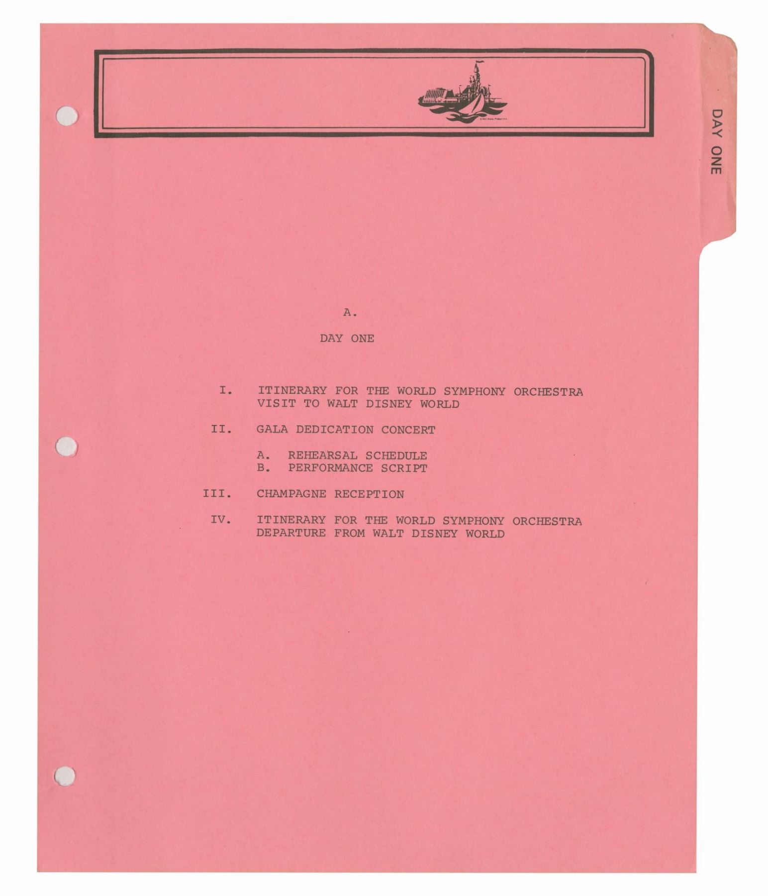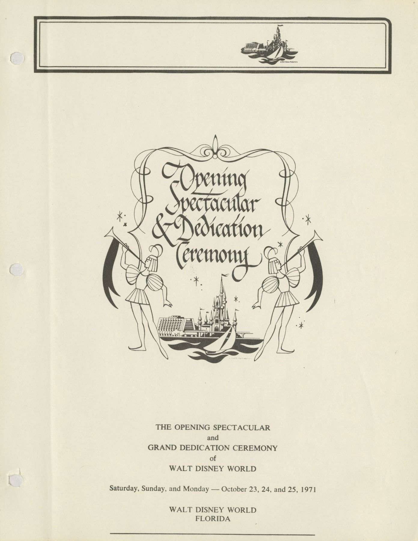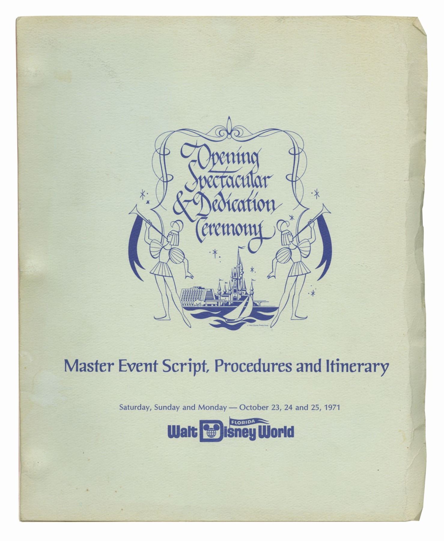 (Walt Disney World, 1971) A master event script including the procedures and itinerary for the grand opening ceremony and dedication occurring on October 23, 24, and 25 of 1971. This detailed guide includes a breakdown of scripts, events, and travel plans for those involved in the celebration and offers a scarcely seen look into the backstage experience of Walt Disney World's grand opening. Measuring 11"x9", the script is in very good condition with expected wear from age and use, including some bending along the edges and several small punctures along the binding on the back cover.