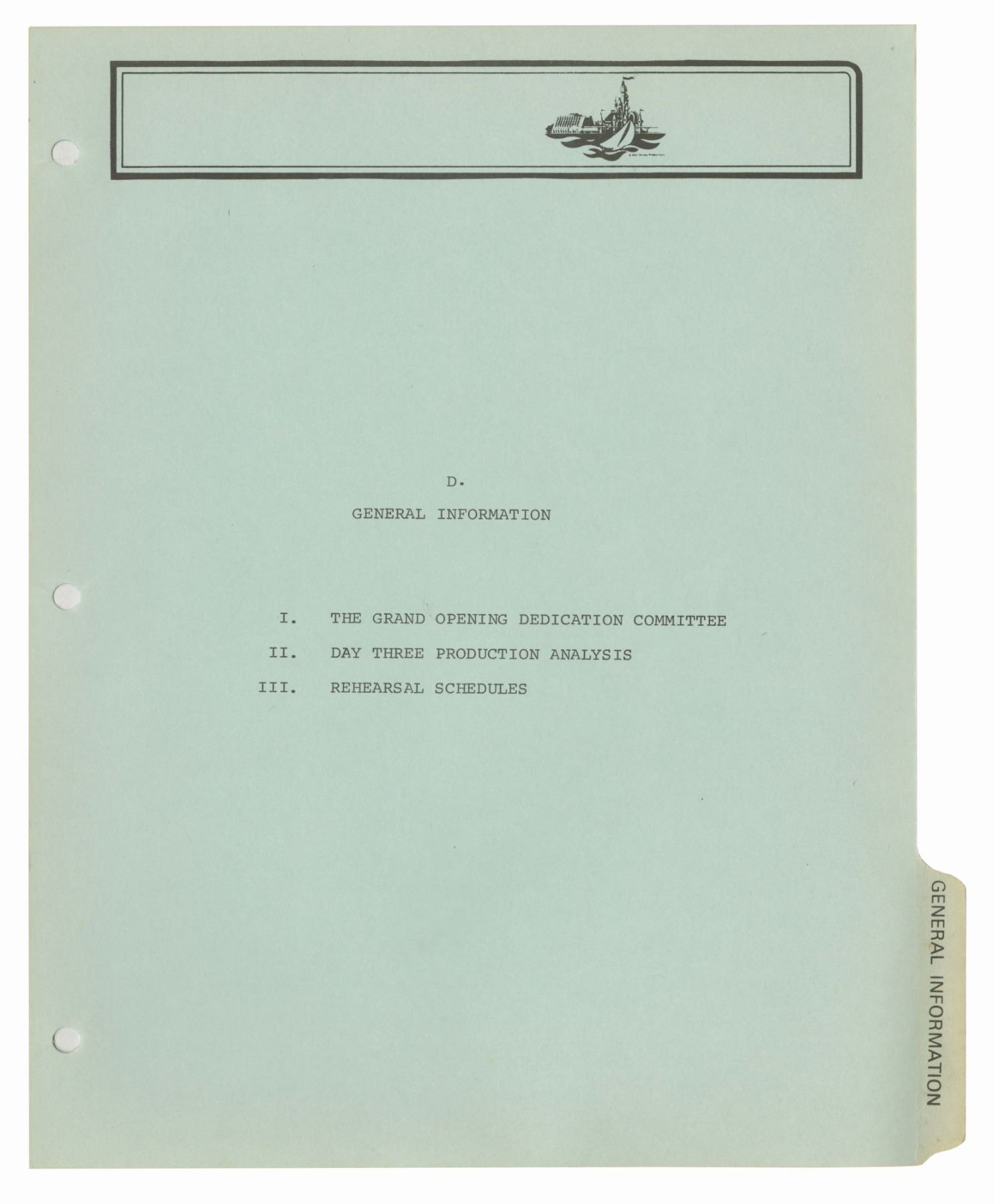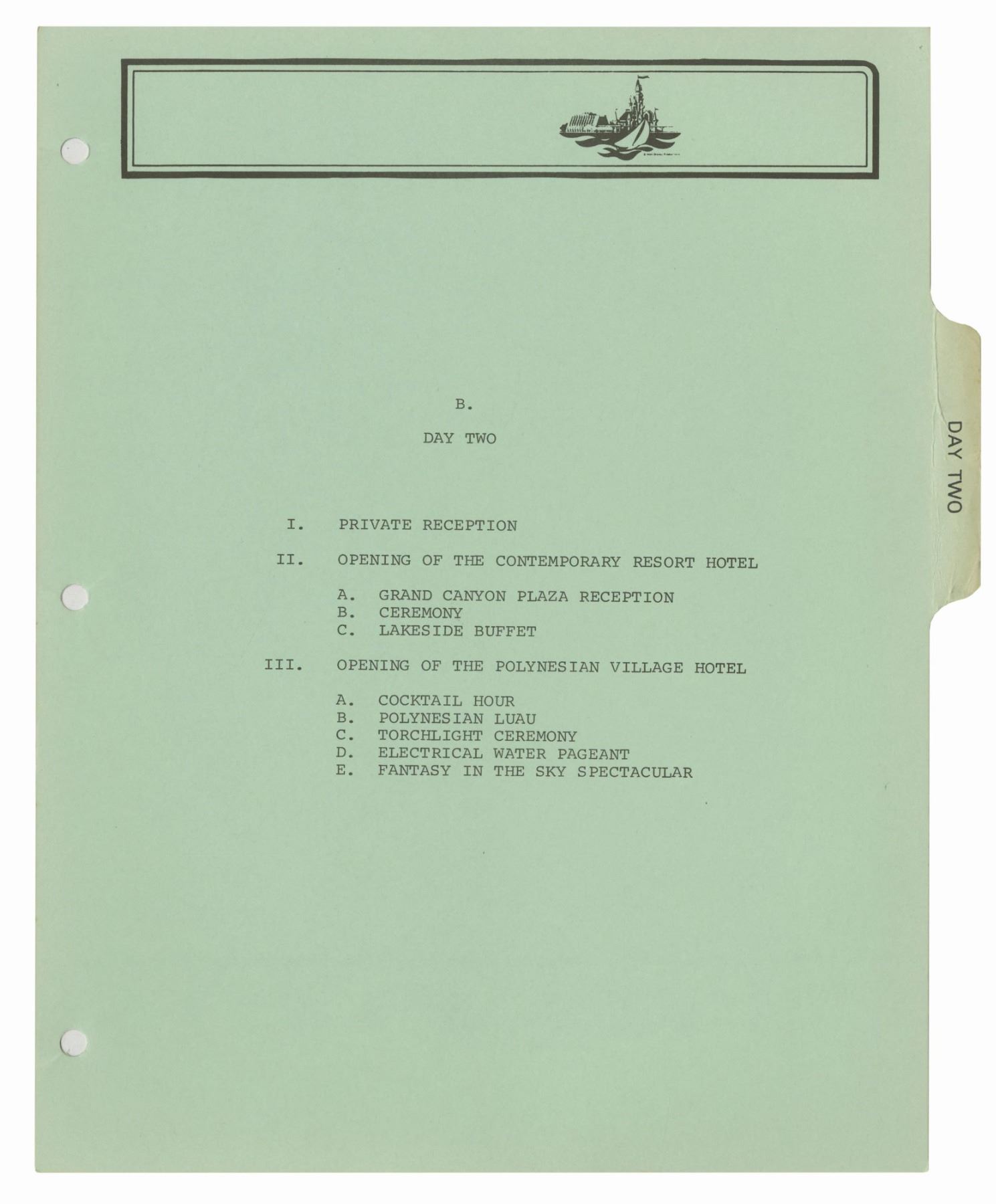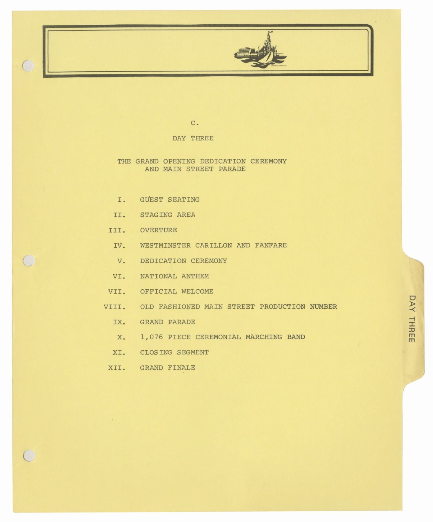 (Walt Disney World, 1971) A master event script including the procedures and itinerary for the grand opening ceremony and dedication occurring on October 23, 24, and 25 of 1971. This detailed guide includes a breakdown of scripts, events, and travel plans for those involved in the celebration and offers a scarcely seen look into the backstage experience of Walt Disney World's grand opening. Measuring 11"x9", the script is in very good condition with expected wear from age and use, including some bending along the edges and several small punctures along the binding on the back cover.