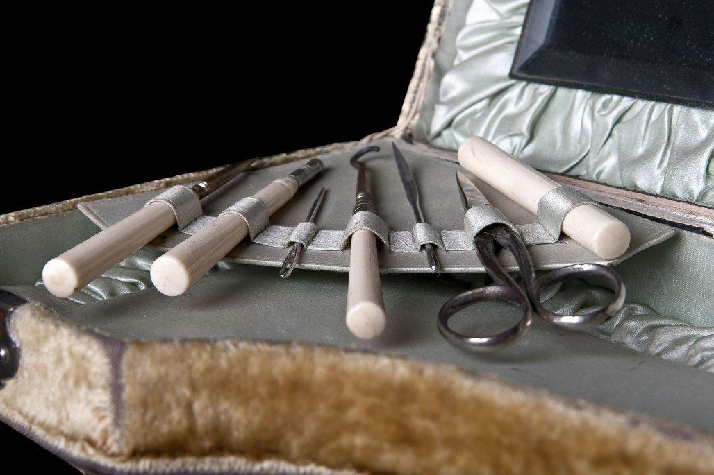 Reise-Necessaire mit Musikdose. Museumsqualität. 26,5 x 16,5 x 10cm. Hersteller unbekannt, France, circa 1900.