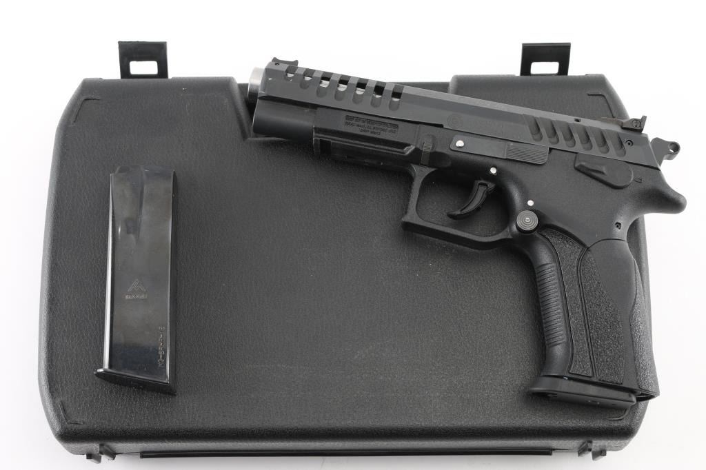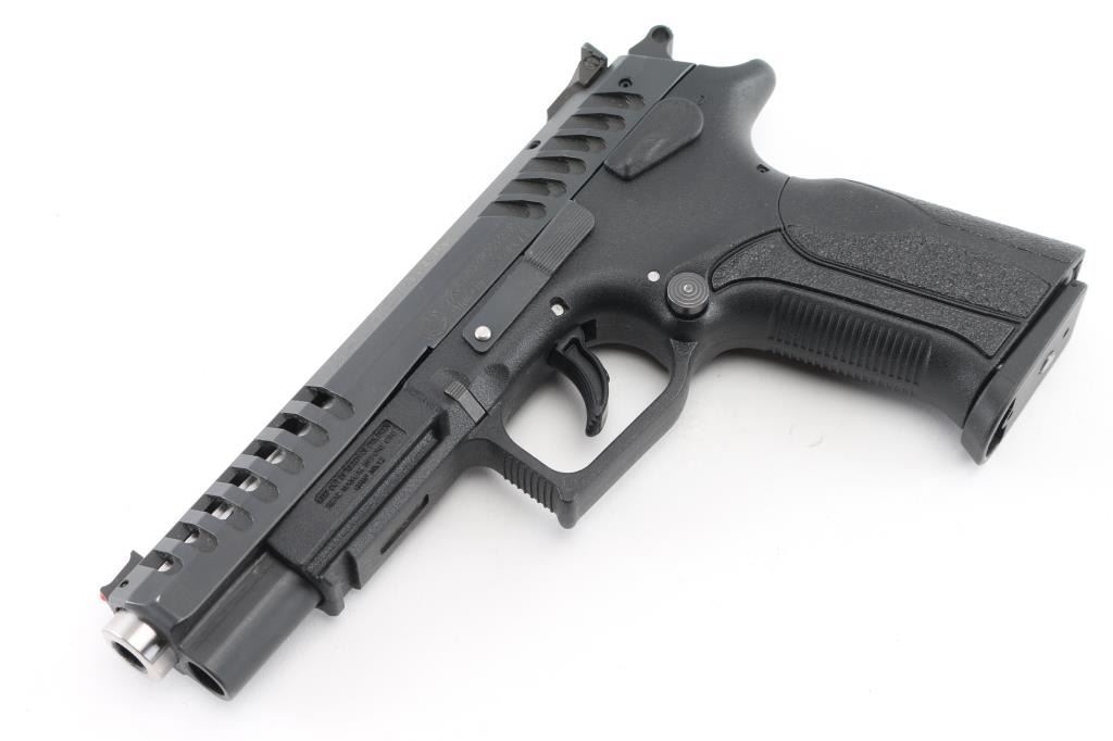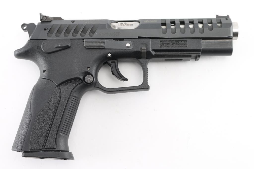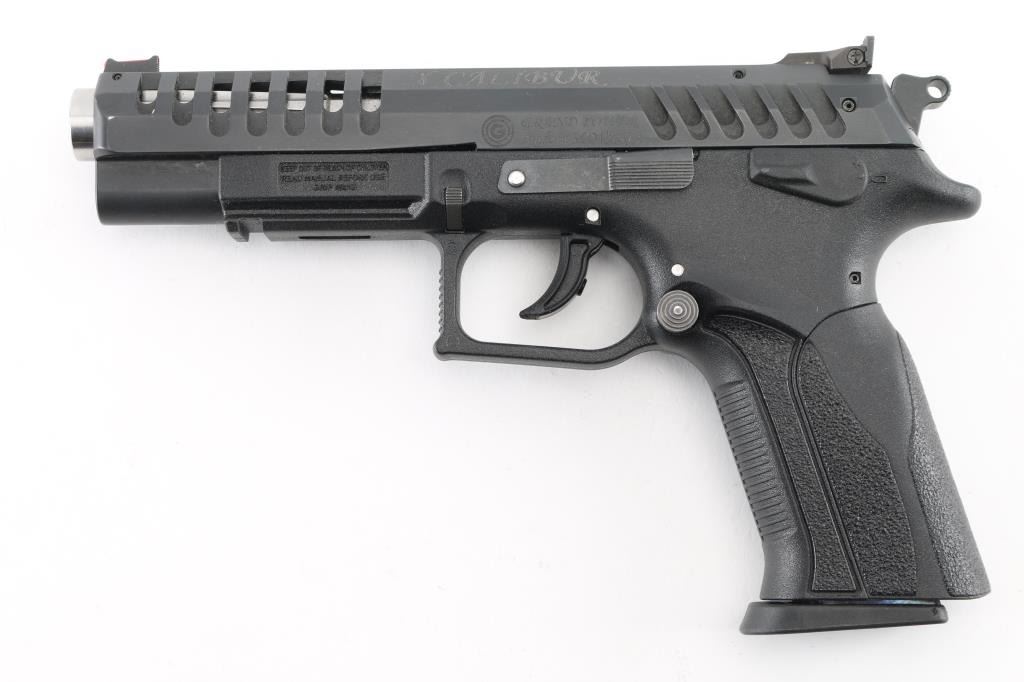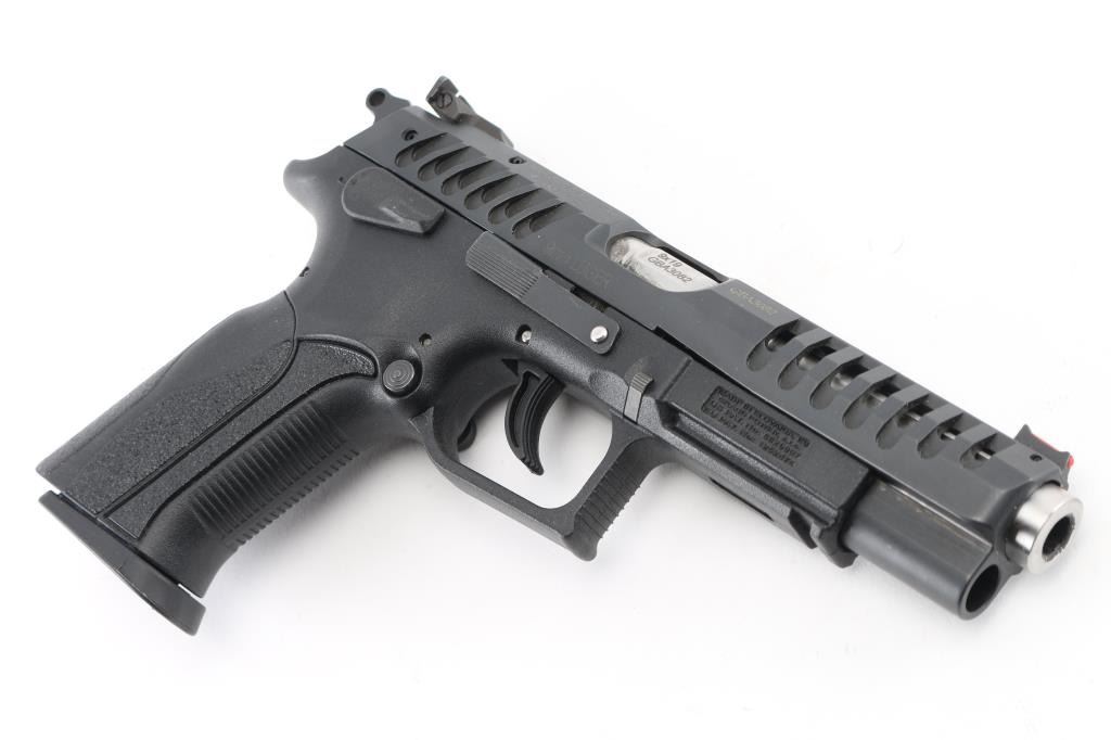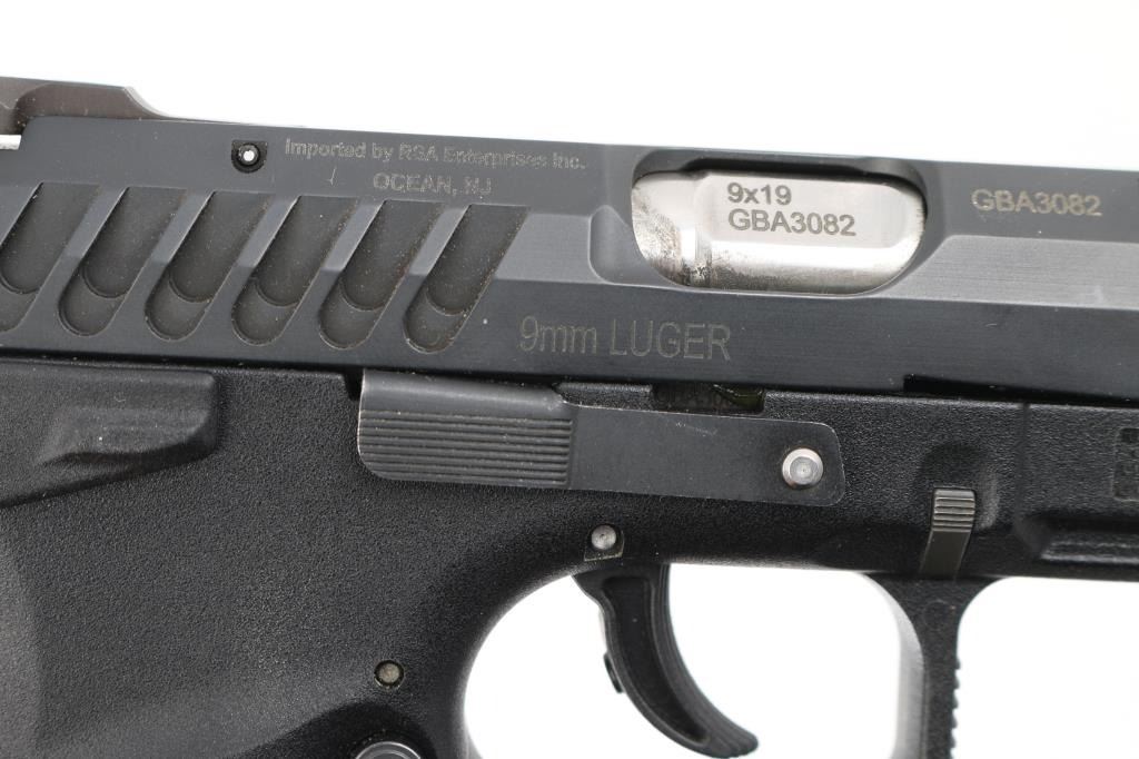 Slovakian semiautomatic pistol imported by RSA Enterprises, Ocean NJ. Features double/single action with exposed rowel hammer, frame mounted safety, 5" stainless fluted barrel, red fiber-optic front sight, square notch rear, matte black finish, black polymer frame with accessory rail & interchangeable back strap, push button mag release, lanyard stud. Mag release, safety & slide stop are ambidextrous. Overall condition is like new with few signs of use & handling. Includes (2) magazines, several backstraps, foam fitted plastic factory case, manual, cleaning rod, & 2 spare recoil springs. Condition is NRA Excellent - like new, Modern Firearms.