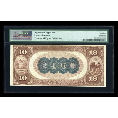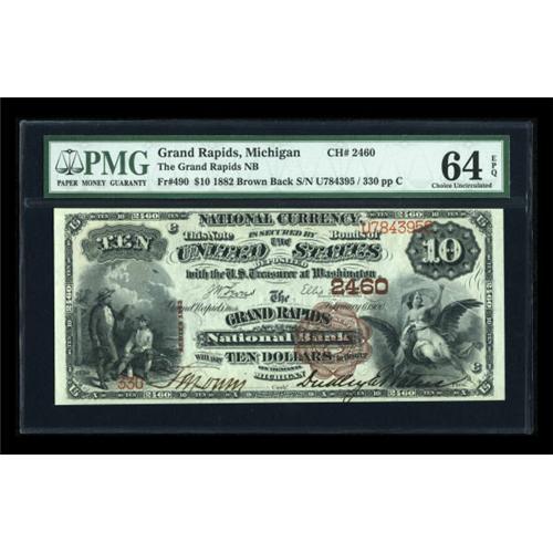 <B>Grand Rapids, MI</B></I> - $10 1882 Brown Back Fr. 490 <B>The Grand Rapids NB</B></I> Ch. # 2460<BR> Another in a line of beautiful Brown Backs from the Flynn collection. This is a peach of a note with great color, loads of originality, and sharp pen signatures. PMG has graded this note <B>Choice Uncirculated 64 EPQ, </B></I>and we see no reason whatever to disagree. <BR><I>From The Thomas M. Flynn Collection</B></I><BR><BR><b>Shipping:</b> Coins & Currency (<a target="_blank" href="http://www.heritageauctions.com/common/shipping.php">view shipping information</a>)