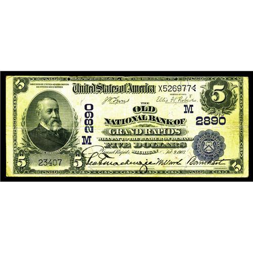 <B>Grand Rapids, MI</B></I> - $5 1902 Date Back Fr. 590 <B>The Old NB</B></I> Ch. # (M)2890<BR>Strong stamped signatures remain on this note that has solid margins. <B>Fine-Very Fine.</B></I>