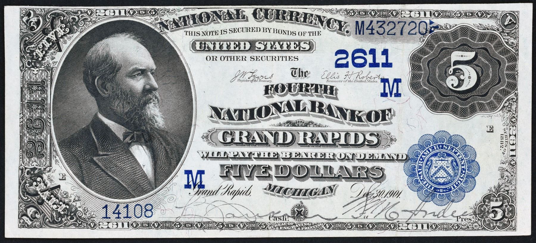 Title: Grand Rapids, Michigan - $5 1882 Date Back Fr. 574 The Fourth National Bank of Grand Rapids Ch. 2611 Extremely Fine