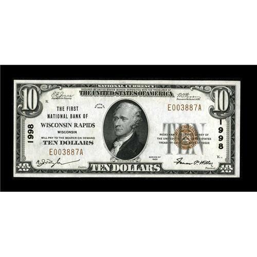 <B>Grand Rapids, WI</B></I> - $10 1929 Ty. 1 <B>The First NB</B></I> Ch. # 1998<BR>One of two near sequential examples of this Grand Rapids bank. The paper quality is exceptional. <B>Choice Crisp Uncirculated.</B></I><BR><BR><b>Shipping:</b> Coins & Currency (<a target="_blank" href="http://www.heritageauctions.com/common/shipping.php">view shipping information</a>)