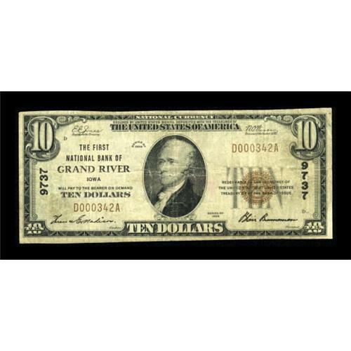 <B>Grand River, IA</B></I> - $10 1929 Ty. 1 <B>The First NB</B></I> Ch. # 9737<BR> Tonight's offering is from the only bank to issue in this Decatur County locale. It grades a solid <B>Fine</B></I> and is a new addition to the census, bringing the total population of this type and denomination documented to a still quite challenging five survivors from the 496 sheets printed.<BR><BR><b>Shipping:</b> Coins & Currency (<a target="_blank" href="http://www.heritageauctions.com/common/shipping.php">view shipping information</a>)