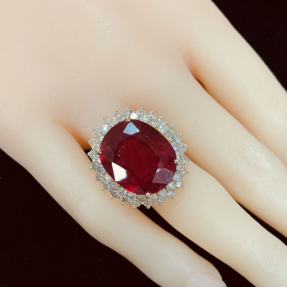 Genuine Ruby (Treated) and Earth-Mined Diamond Ring.& nbsp; This stunning 14 karat yellow gold ring features a 23.25 carat oval-cut, bright-red, prong-set ruby with 2.56 carats of round, brilliant-cut, H-I color, SI1-SI3 clarity diamonds in the floating tiered halos.& nbsp; The ring bears the Oscar Friedman hallmark and is US size 7.75 with triple-split shoulders and an approximate 3.2 mm shank.& nbsp; This ring can be resized for an additional $100, please allow an additional 10 days for shipping if we resize it.& nbsp; This ring is certified and appraised for $16,000.00 estimated retail replacement value.& nbsp; CHECK OUT THE SPECTACULAR RUBY JEWELRY IN LOTS #143, #144, AND #145 TO COMPLETE A SUITE!!!!