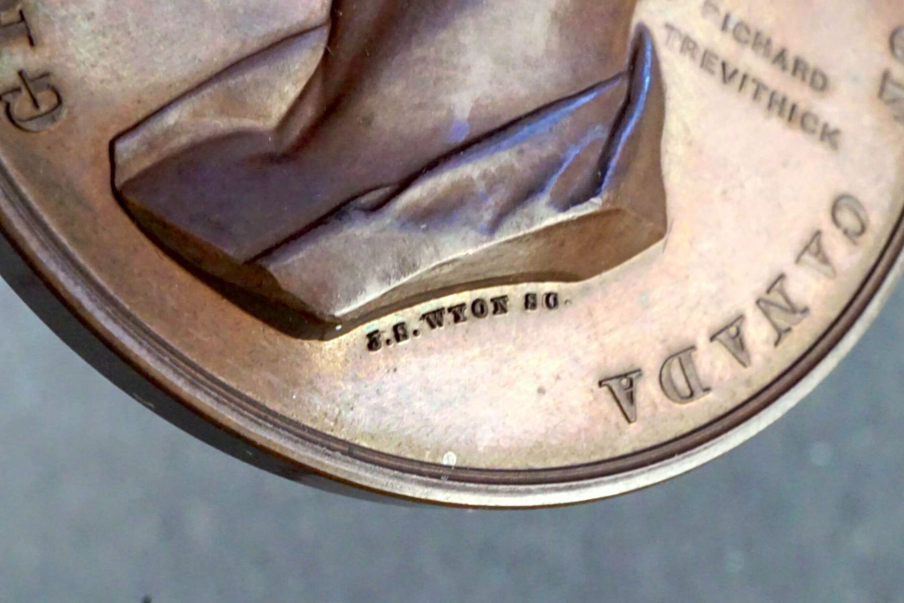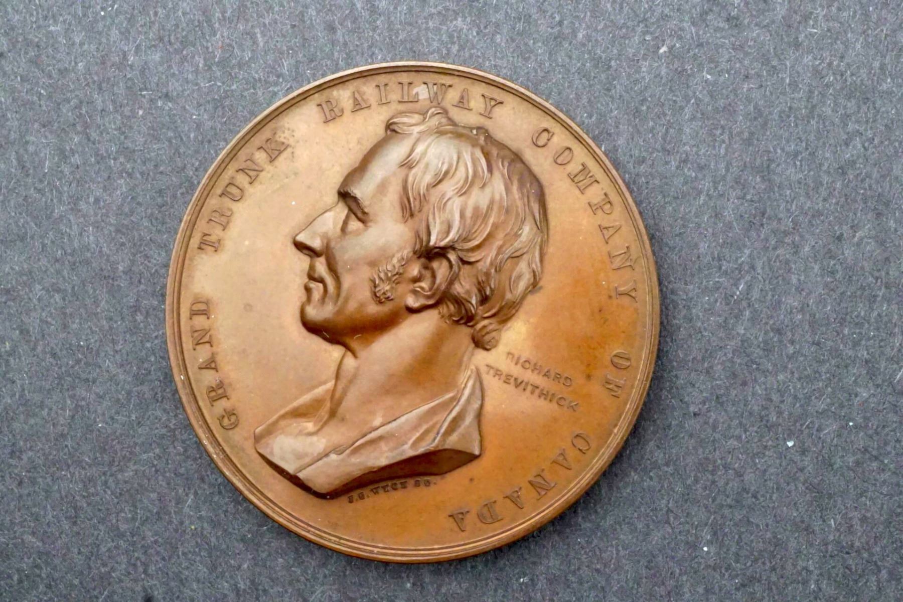 45 mm, 48.4 grams. Obverse: GRAND TRUNK RAILWAY COMPANY OF CANADA Bust, left, J. S. WYON signed below. RICHARD TREVITHICK in two lines of fine text in the right field. Reverse: a lozenge unengraved. Above: Presented by… Presented to….Below: For…. Condition is a glossy, choice UNC.