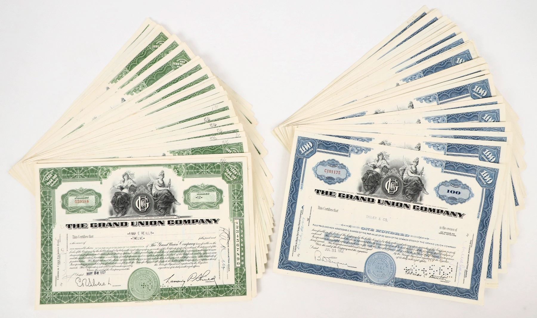 About 70 issued stock certificates from The Grand Union Company. Green ink and allegorical vignette for less than 100 shares; blue ink, same vignette for 100 share certificates.