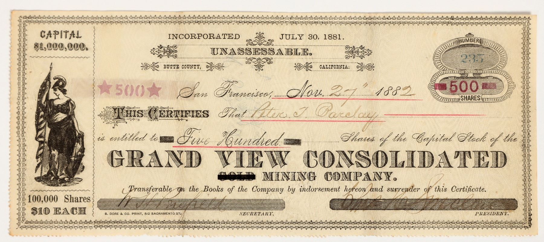 "Butte County, California" printed at top. Inc. July 1881. No. 235, issued for 500 shares to Peter Barclay in 1882 in SF. Signed by president Charles Sinclair and the secretary. Not cancelled. Allegorical vignette. Pinholes, deep folds. 4 x 9.5" The Grand View Mine was near Forbestown, Butte County.