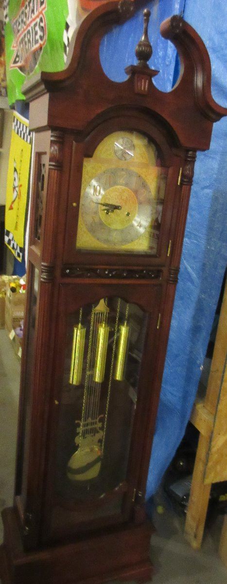Tempus Fugit embossed on Dial on face of Grandfather Clock with Key, excellent condition beautiful cherry wood stain,