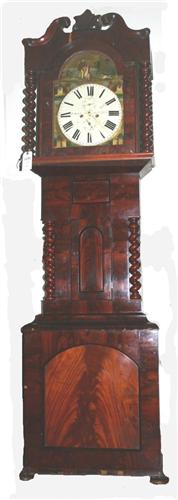 Grandfather clock in mahogany measures approximately 96" tall and 26" wide. Veneer is missing in several places..