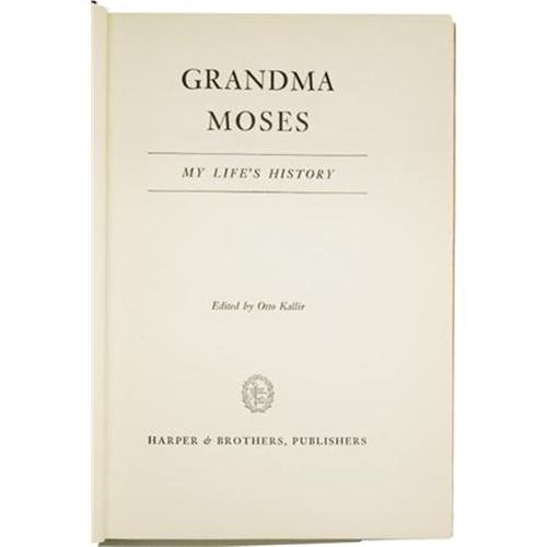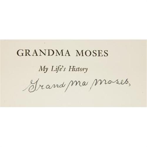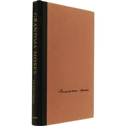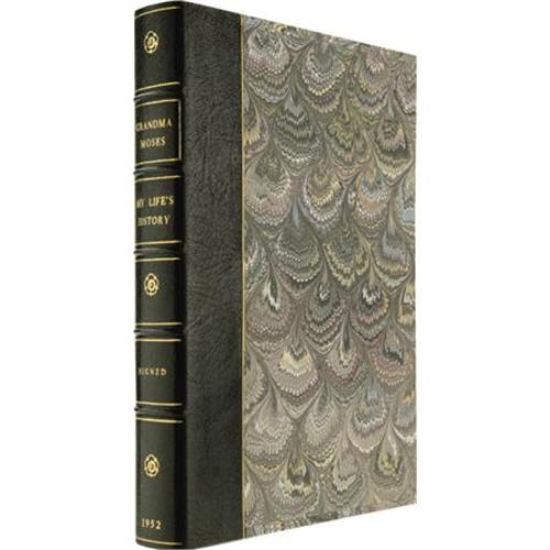 <B>Grandma Moses: Signed First Edition of <I>My Life's History</B></I>.</B></I> Edited by Otto Kallir. (New York: Harper & Brothers, 1952), first edition, 140 pages plus eight pages of letter reproductions and 16 full-color reproductions of Grandma Moses paintings, peach paper boards shelf-backed in black cloth with gilt lettering on the spine and black lettering on the front board, 8vo (6.25" x 9.5"), no dust jacket, clear plastic protective sleeve on boards, housed in a black quarter leather slipcase with marbled boards and gilt titles & five raised bands on the spine. Signed "<I>Grandma Moses</B></I>" on the half-title page. A 1957 TLS signed by the book's editor, Otto Kallir, is laid-in. The letter is an invitation to a Grandma Moses art exhibition at the Galerie St. Etienne in New York, the gallery that first brought Grandma Moses to the world. The first edition of <I>My Life's History</B></I> presented here is in very good condition, with noticeable wear to the bottom edge and bumped corners. An absolutely essential addition to any fan of American folk art in general or Grandma Moses in particular.<BR><BR><b>Shipping:</b> Books & Catalogs (<a target="_blank" href="http://www.heritageauctions.com/common/shipping.php">view shipping information</a>)