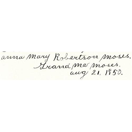 <B>Grandma Moses Signed Book: <I>Grandma Moses American Primitive</B></I></B></I> (New York: Doubleday & Company Inc., 1947), 136 pages, black and white plates included, introduction by Louis Bromfield, green and white cloth, 8vo (8.5" x 11.3"), dust jacket, signed on title page, "<I>Anna Mary Robertson Moses. Grandma Moses. Aug. 21, 1950.</B></I>" Grandma Moses was known for her beautiful renderings of the American landscape. She lived to be over 100 years old! Inscribed on her tombstone is this epitaph, "<I>Her primitive paintings captured the spirit and preserved the scene of a vanishing countryside.</B></I>" <BR><BR>The book is in good condition, with only minor wear to the dust jacket, as it has become slightly torn and worn with age. <BR><BR><B>Important notic