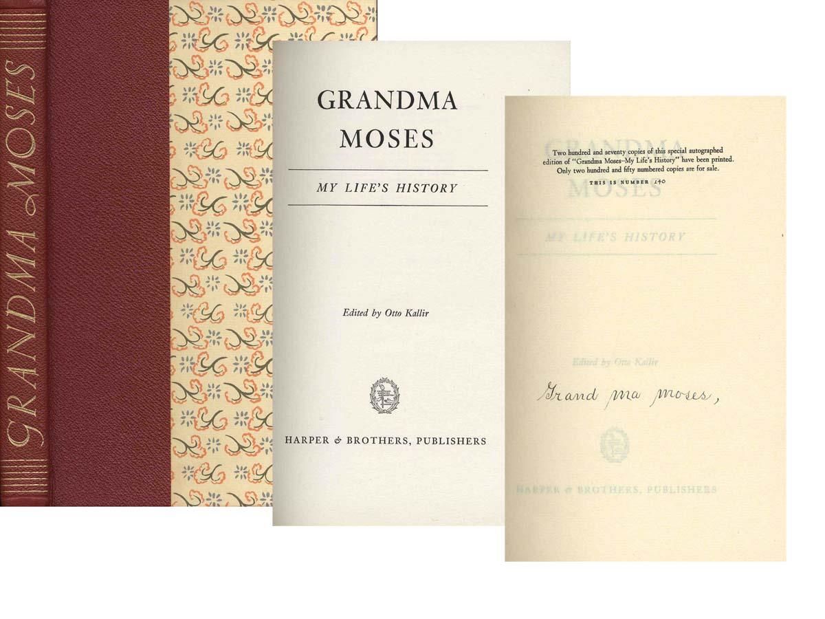 Signed limited edition of ''My Life's History'' by Grandma Moses, the folk artist icon who began painting in her seventies. Limitation page is signed ''Grand ma moses,'' and is pasted onto the title page of this first edition, as issued. #140 of 250 limited edition copies. New York: Harper & Bros.: 1952. In fine condition, with original glassine dustjacket and slipcase, both near fine.