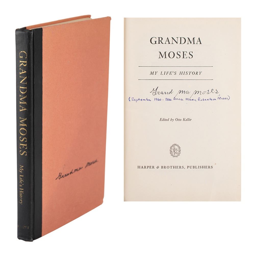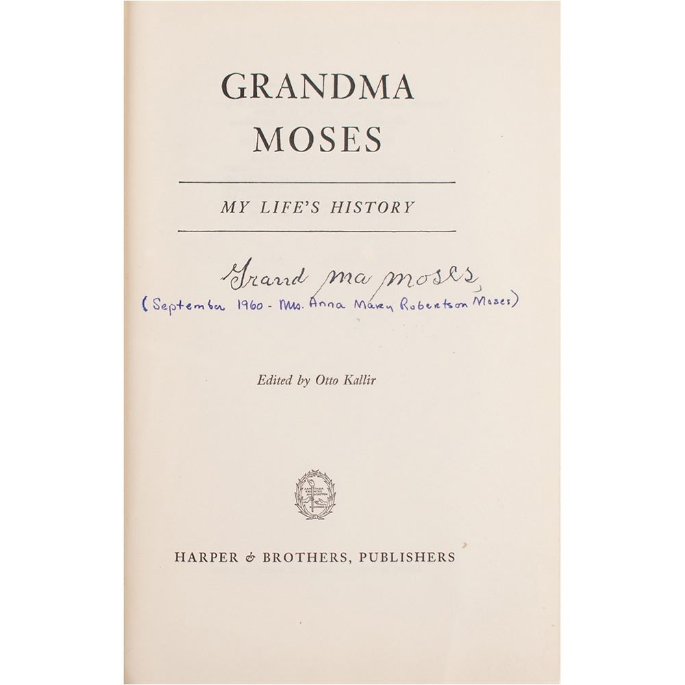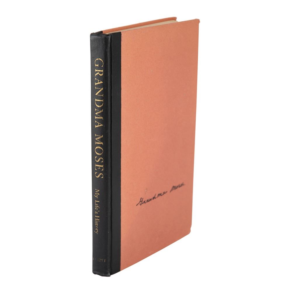 Signed book: My Life's History. Later printing. NY: Harper &Y Brothers, 1952. Hardcover, 6.5 x 9.5, 140 pages. Signed on the title page in black ink, "Grandma Moses," with a collector's notation below stating that it was obtained in September 1960. In fine condition, with bumped corners.