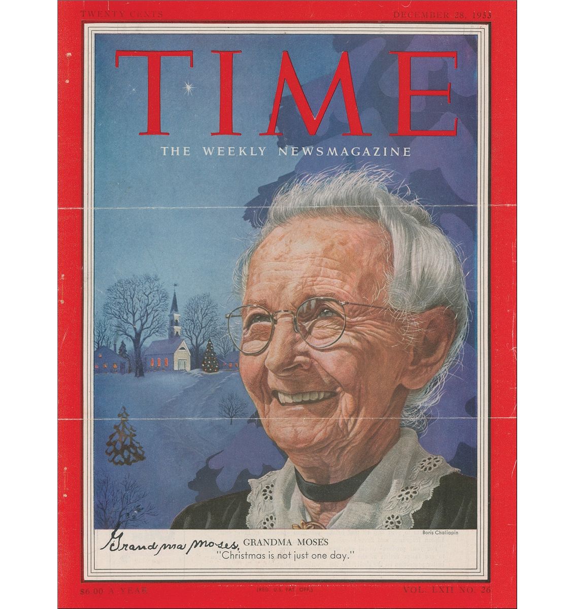 Magazine cover from the December 28, 1953, issue of Time magazine, signed in black ink, “Grandma Moses.” In very good condition, with two horizontal mailing folds, some scattered light creases, and staple holes to left edge.