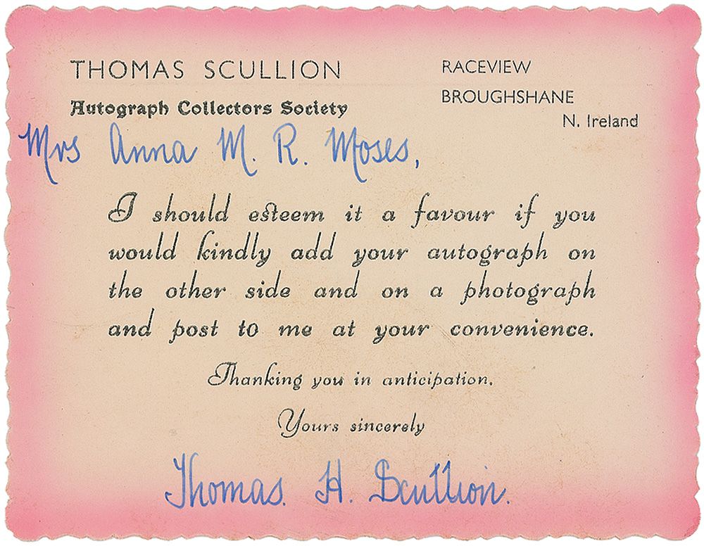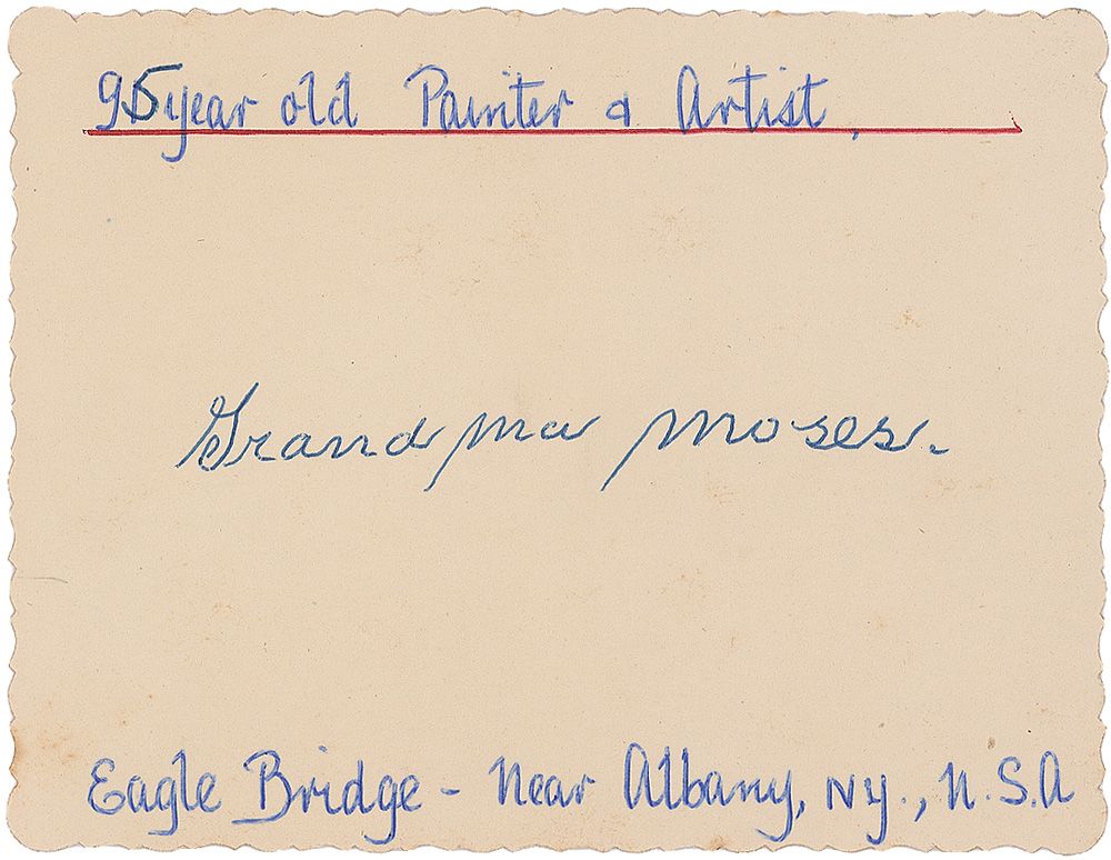 Ballpoint signature, “Grandma Moses,” on the reverse of an off-white 4.5 x 3.25 deckle-edge card bearing a printed letter from collector Thomas Scullion, with collector’s notations to top and bottom of signed side. In fine condition.