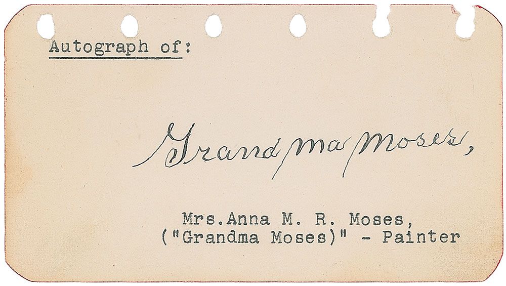Vintage ink signature, “Grandma Moses,” on an off-white 4.5 x 2.5 page. In fine condition.