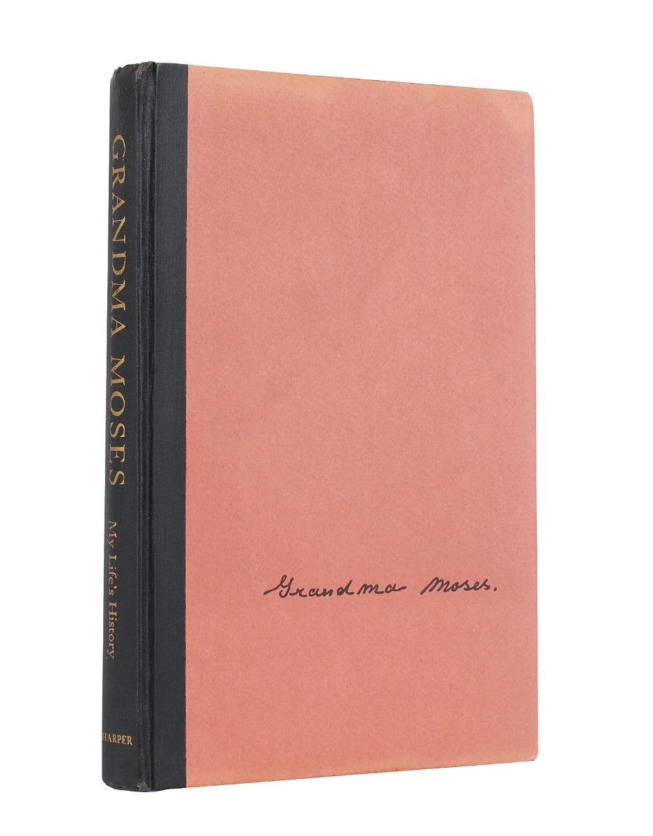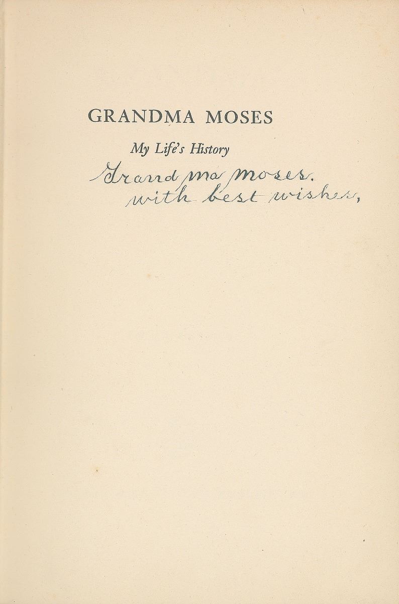 Signed book: My Life’s History. First edition. NY: Harper & Brothers, 1952. Hardcover, 6.5 x 9.5, 140 pages. Signed on the half-title page in fountain pen, “Grandma Moses, with best wishes.” In fine condition, with mild foxing and toning to pastedowns.