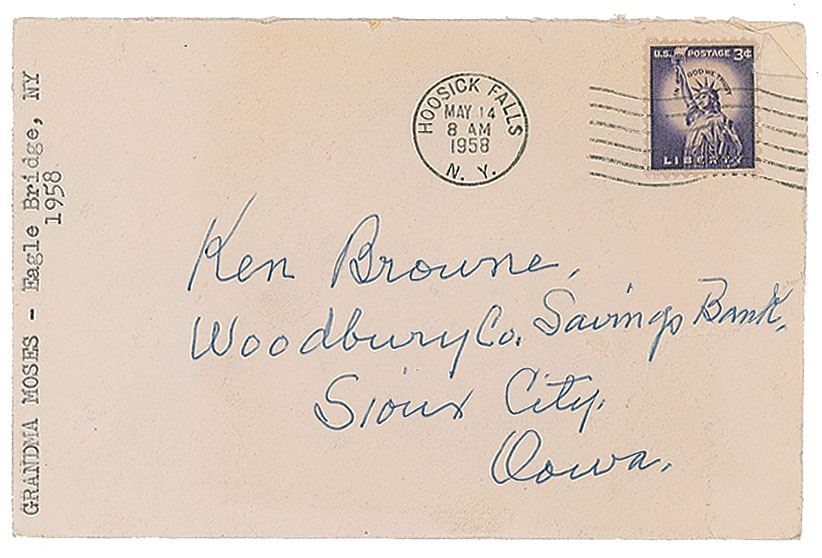 Vintage glossy 3.25 x 4.25 photo of the artist, signed on the reverse in blue ballpoint, "Grandma Moses." Reverse bears a typed collector's notation indicating that it was received in 1958. In fine condition, with two areas of light discoloration to the photo. Accompanied by the original mailing envelope.