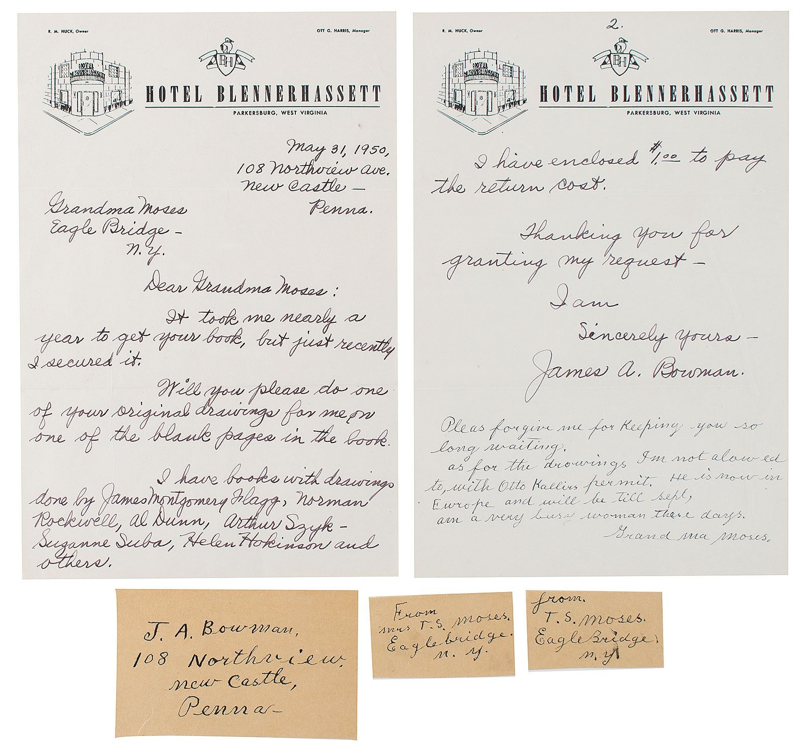 ANS, one page, 6 x 9, Hotel Blennerhassett letterhead, May 31, 1950. Note written at the end of James A. Bowman's two-page request for a sketch inside a book, in full: "Pleas forgive me for keeping you so long waiting. As for the drawings I'm not alowed to, with Otto Kallir's permit. He is now in Europe and will be till Sept, am a very busy woman these days." In fine condition. Accompanied by two clipped return addresses in Moses's hand, both incorporating her name ("Mrs. T. S. Moses" and "T. S. Moses"), and a clipped address panel to Bowman in her hand.