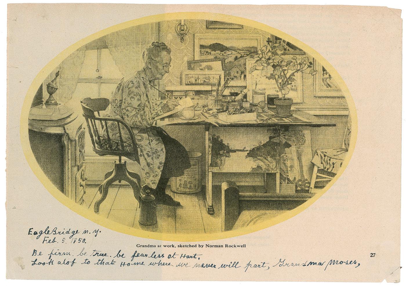 AQS on a vintage 10.5 x 8 magazine photo of a Rockwell portrait of Moses at work. She writes: “Eagle Bridge, N.Y., Feb. 5, 1950. Be firm, be true, be fearless at Hart. Look a lot to that home where we never will part, Grandma Moses.” Scattered creasing and wrinkling, light edge wear and chipping, and some mild toning to borders, otherwise fine condition. Pre-certified PSA/DNA and RRAuction COA.