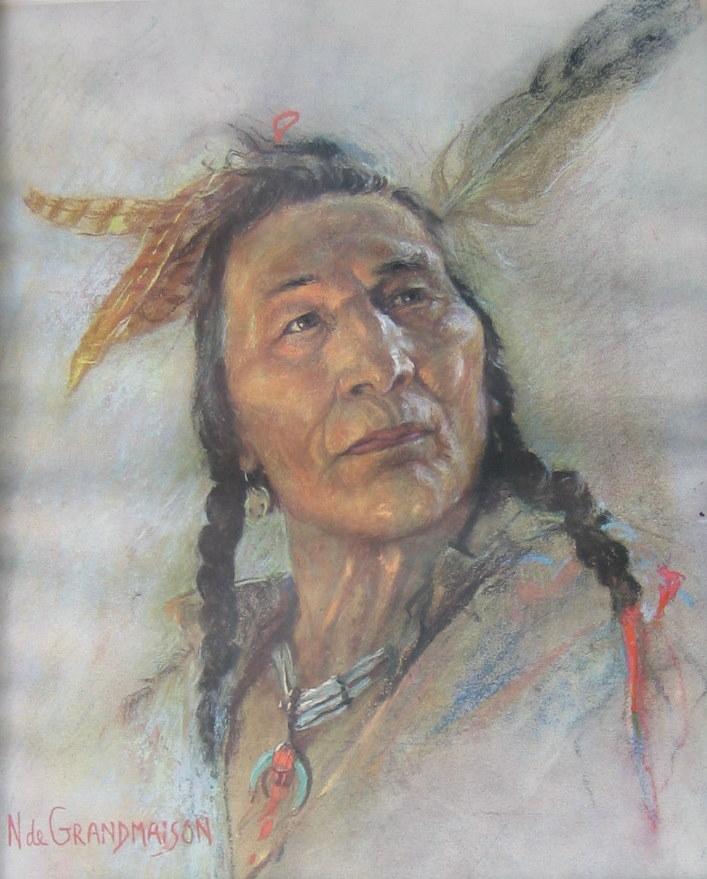 NICHOLAS DE GRANDMAISON ARCA (Canadian 1892 - 1978 ) Indian Brave Lithograph 20" x 16" (50.8 x 40.64cm.) Signed in print; #'Y' - 736 verso. Published by The Last Arrow Ltd.