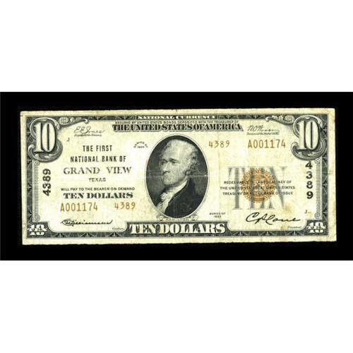<B>Grandview, TX</B></I> - $10 1929 Ty. 2 <B>The First NB</B></I> Ch. # 4389<BR> This attractive <B>Fine+</B></I> is one of only about a dozen small size notes known from this locale. The other issuing bank in town only issued large size notes.<BR><BR><b>Shipping:</b> Coins & Currency (<a target="_blank" href="http://www.heritageauctions.com/common/shipping.php">view shipping information</a>)