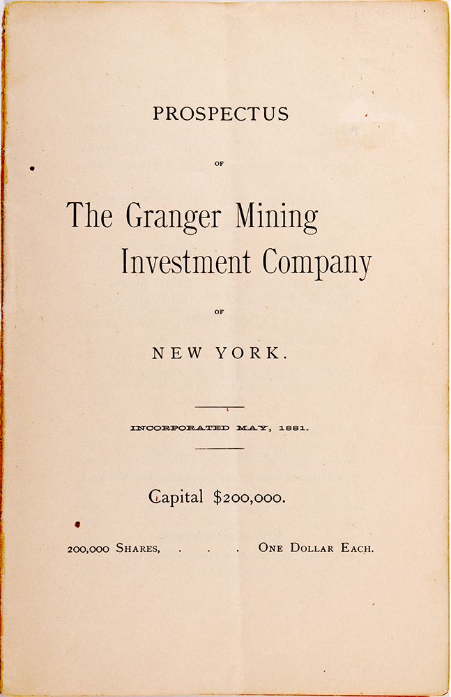 This prospectus includes information on the company’s property, which was located 21 miles from Salt Lake City. There is also a report written by the General Manager, Col. L.E. Granger. The prospectus is 11 pages long and was printed by Arthur & Bonnell, New York. A publishing date does not appear, but the incorporation day of May 1881 does. It measures 9”x 5.75” There is some wear on the item including creasing. - HKA#65832
