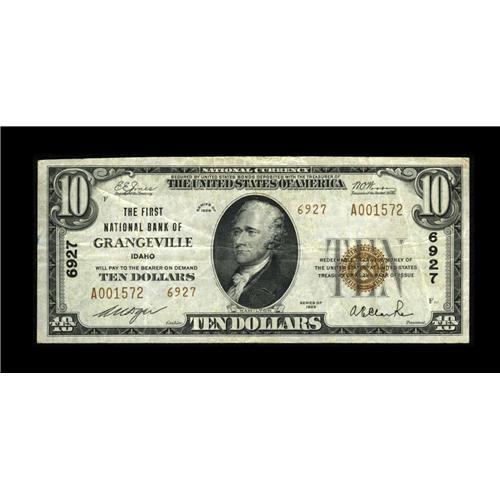 <B>Grangeville, ID</B></I> - $10 1929 Ty. 2 <B>The First NB</B></I> Ch. # 6927<BR>This solid <B>Very Fine</B></I> note is one of just three of the Type 2 $10 denomination traced from this elusive issuer. We've handled it twice before, first in our 2001 Greater Cincinnati Numismatic Exposition auction, where it realized $1,045, then in our 2004 Florida United Numismatists sale, where it sold for $1,725. Every bit as scarce now as it was then and with the market for better Nationals even stronger now, we expect that it will sell for even more tonight.<BR><BR><b>Shipping:</b> Coin/Currency (<a target="_blank" href="http://www.heritageauctions.com/common/shipping.php">view shipping information</a>)