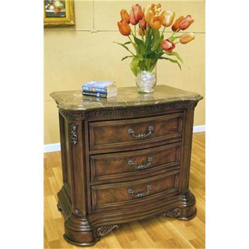 Marble Top Quality Mahogany Finish Nightstand / Bed Side Table / Commode. This piece is constructed from solid birch wood & high quality Mahogany veneers & Burl Inlays and finished in a rich medium mahogany finish.