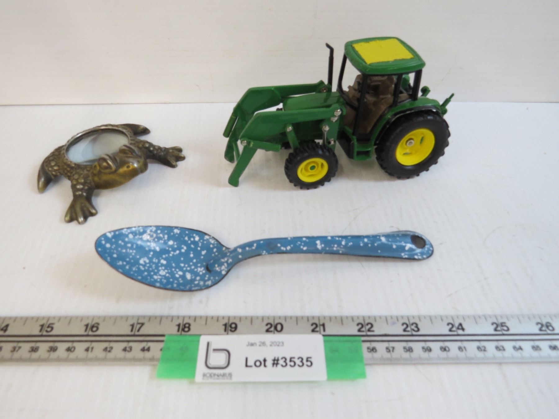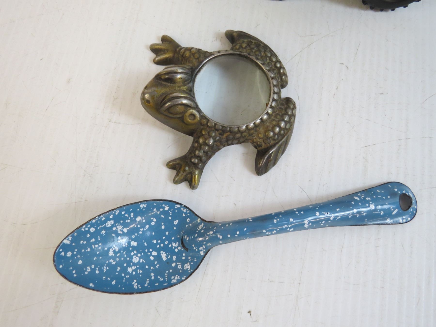 Granite Ware Spoon - Frog Magnifying Glass - Metal Tractor (damaged)